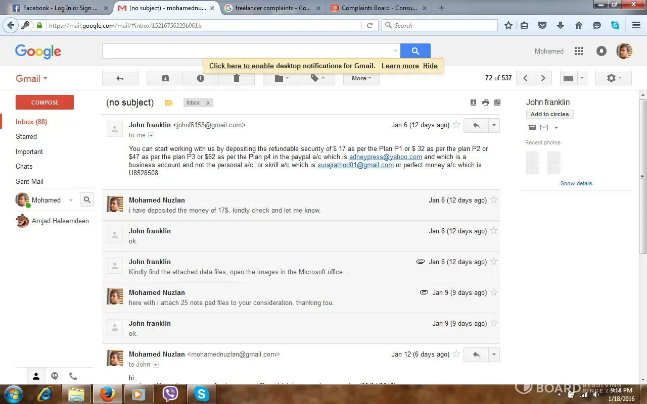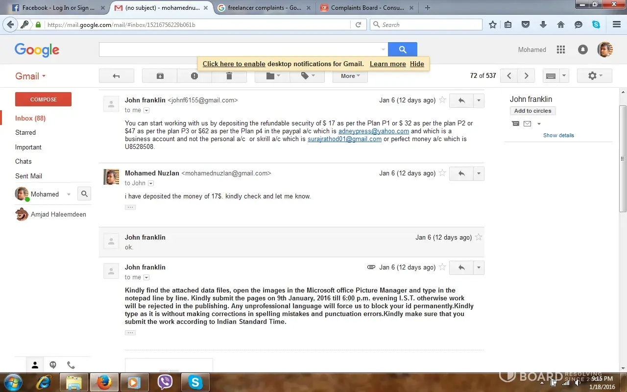 i am a member of freelancer. someone chatted and asked my mail id to give a retyping job. i gave my email id. than they said to deposit 17$ to start the job. i paid through paypal to the above email id (1st one) than they sent 25 images to type in to notepad finish it within 4 days. they said they will pay 3$ per page. i did and sent to them. after that no response. they cheated me. i sent many mails to those email id's they didnt even response. the email id which they use John franklin, [protected]@yahoo.com, [protected]@gmail.com