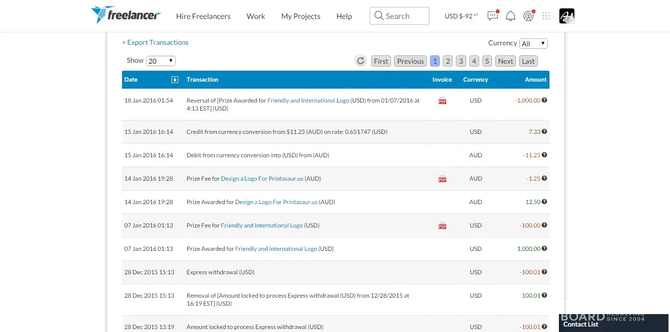 I was awarded a prize on January 7, 2016 for a $1000 with a $100 deduction for a winner fee. I withdrew the amount of $900 earned and when my withdrawal period came around I received nothing so I took to asking them and they claimed it was a put on hold because they wanted to verify the user account. However, the account was verified in almost all aspects except some profile info. I continued contacting them and only just today as of January 18, 2016, they took $1000 from my account leaving me with a negative -$100 deduction. Freelancer stole my money plain and simple. Avoid them at all costs if you are a freelancer. Avoid being robbed.