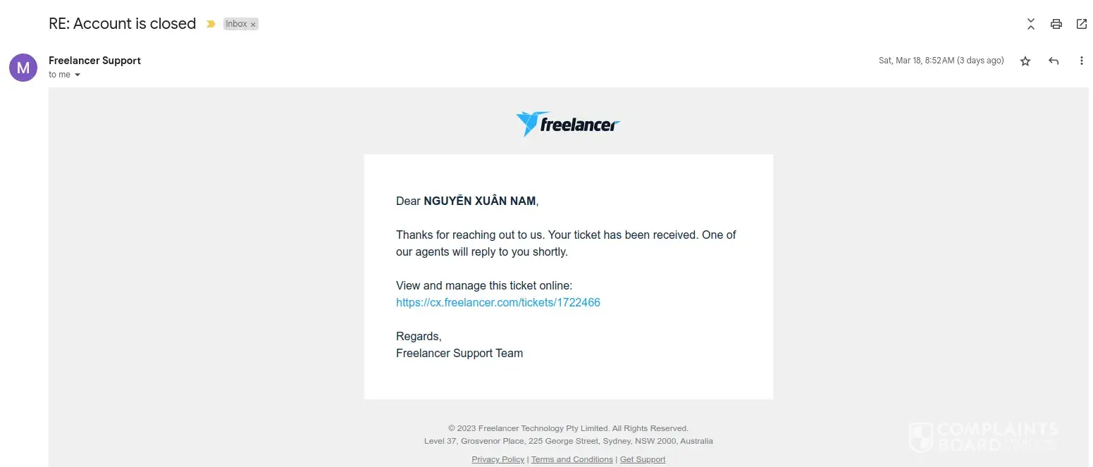 "Thank you for contacting Freelancer.com Support. We regret to inform you that your account has been closed for violating the Freelancer website in accordance with the Freelancer User Agreement found here at https://www.freelancer.com/about/terms