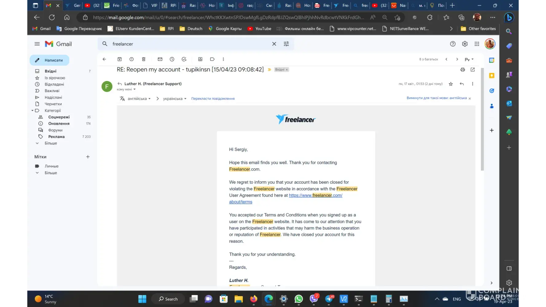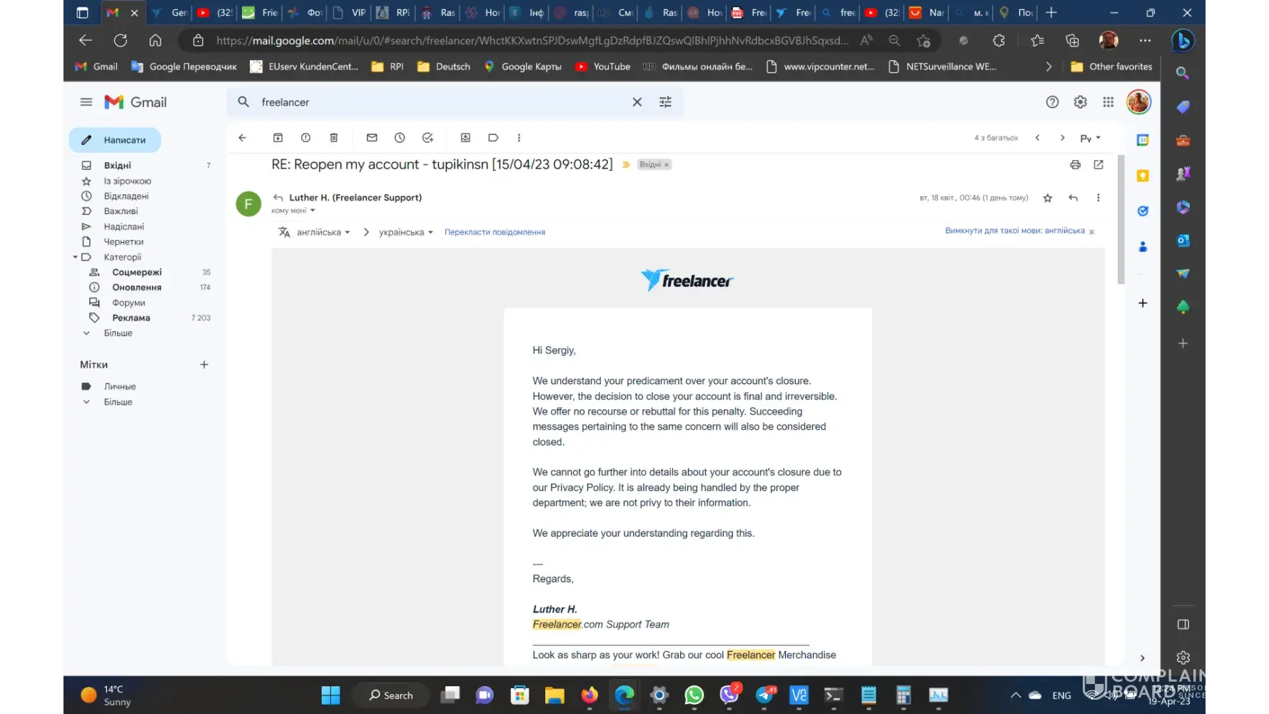 18/04/2023 I had send the new message to freelancer.com support where I demand more detailed explanations of closing account reasons and to pay my money back!