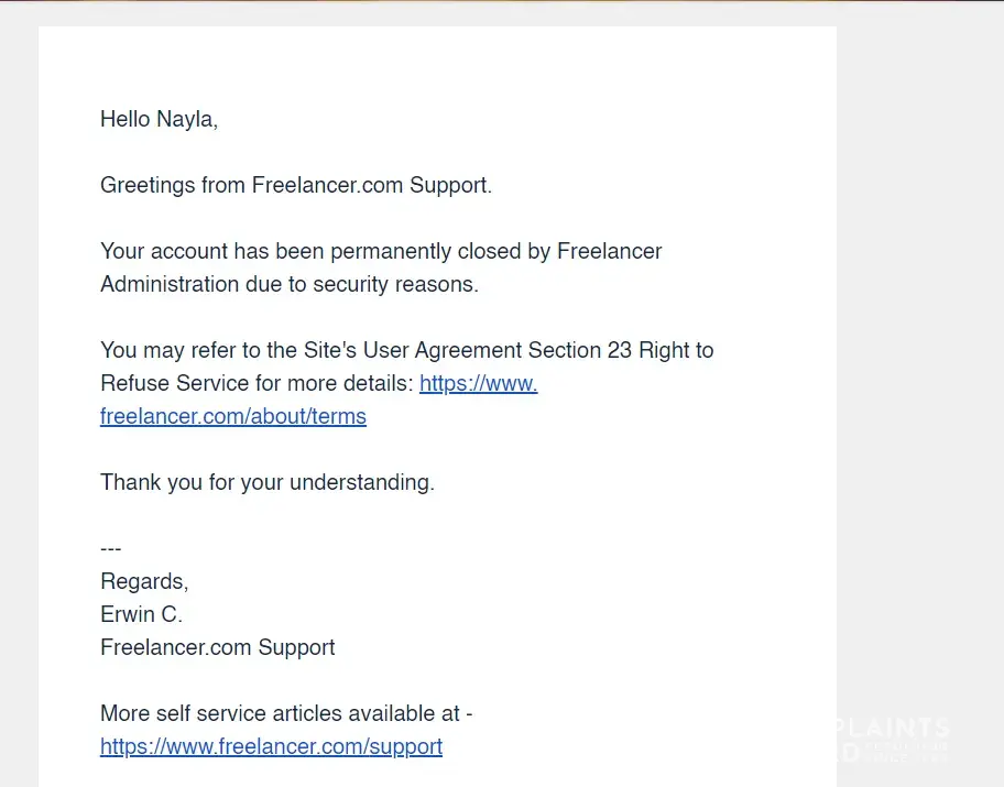 You accepted our terms and conditions when you signed up as a user on the Freelancer website. It has come to our attention that you have participated in activities that may harm the business operation or reputation of Freelancer. We have closed your account for this reason.