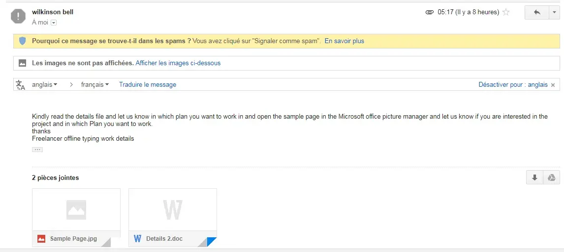 Sir one person shubhammathur3 has give me offer via freelance chat that "Kindly contact us at email id which is sunrisepublishers1@gmail.com to get freelancer offline typing work details." when I contact him he given me offer to do work and send email to me " Kindly read the details file and let us know in which plan you want to work in and open the sample page in the Microsoft office picture manager and let us know if you are interested in the project.