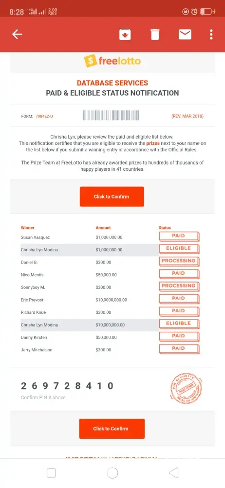 Hi Good day, Im Chrisha Lyn Modina from Cebu City Philippines. It stated that I won a particular price. It is possible to claim the said amount? Im hoping that this is legit since I also need money for my upcoming wedding. And for needs of my baby. Hoping that I will be able to recieve my prize since my baby will have his 1st bday also. Hope for your response soon sir/maam.