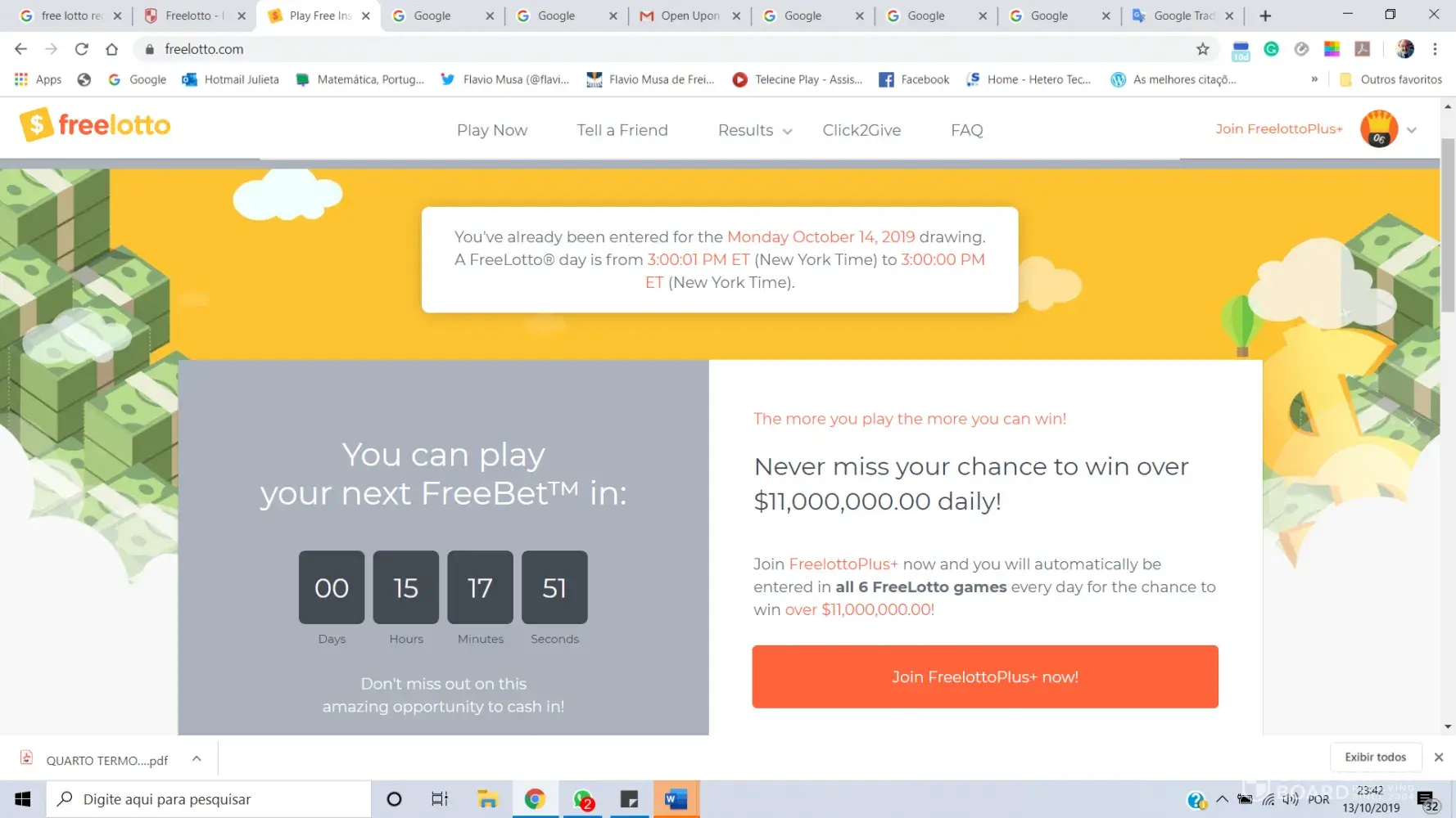 Try FreelottoPlus+ service for 30 days for only €0.99 We're so sure that our FreelottoPlus+ service is the easiest way to play FreeLotto that we're giving you a €14.00 DISCOUNT to prove it.