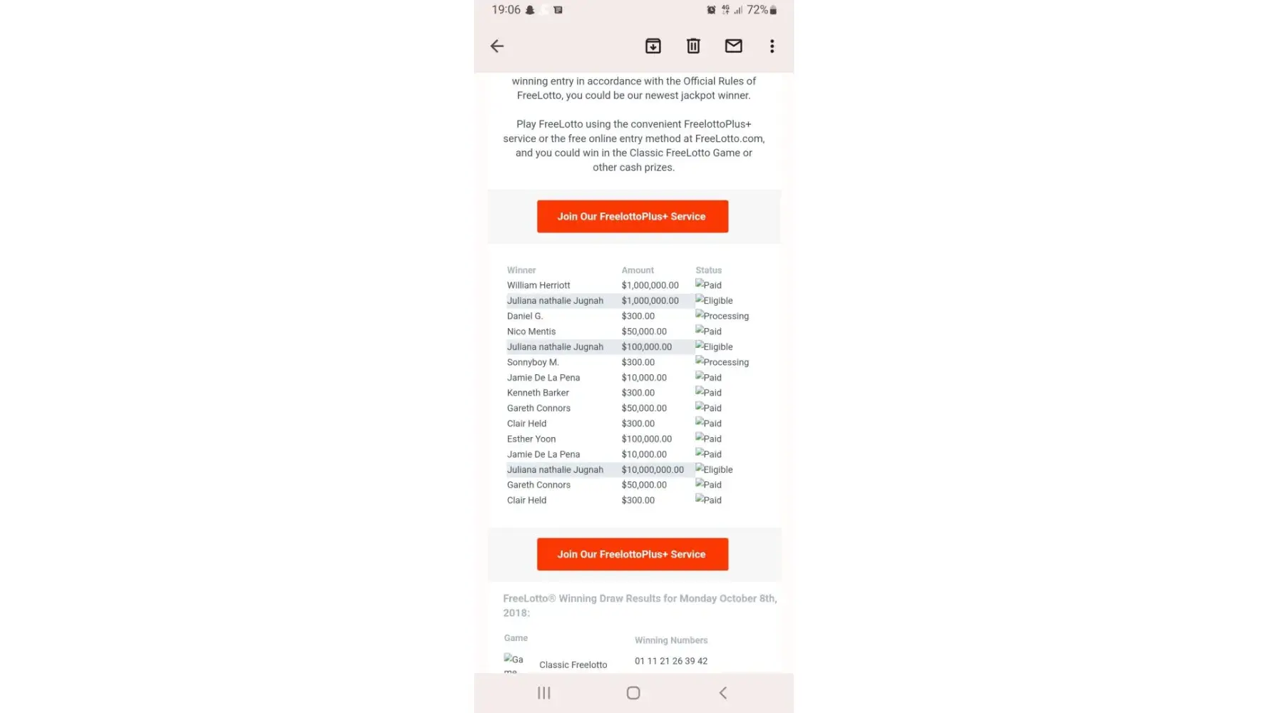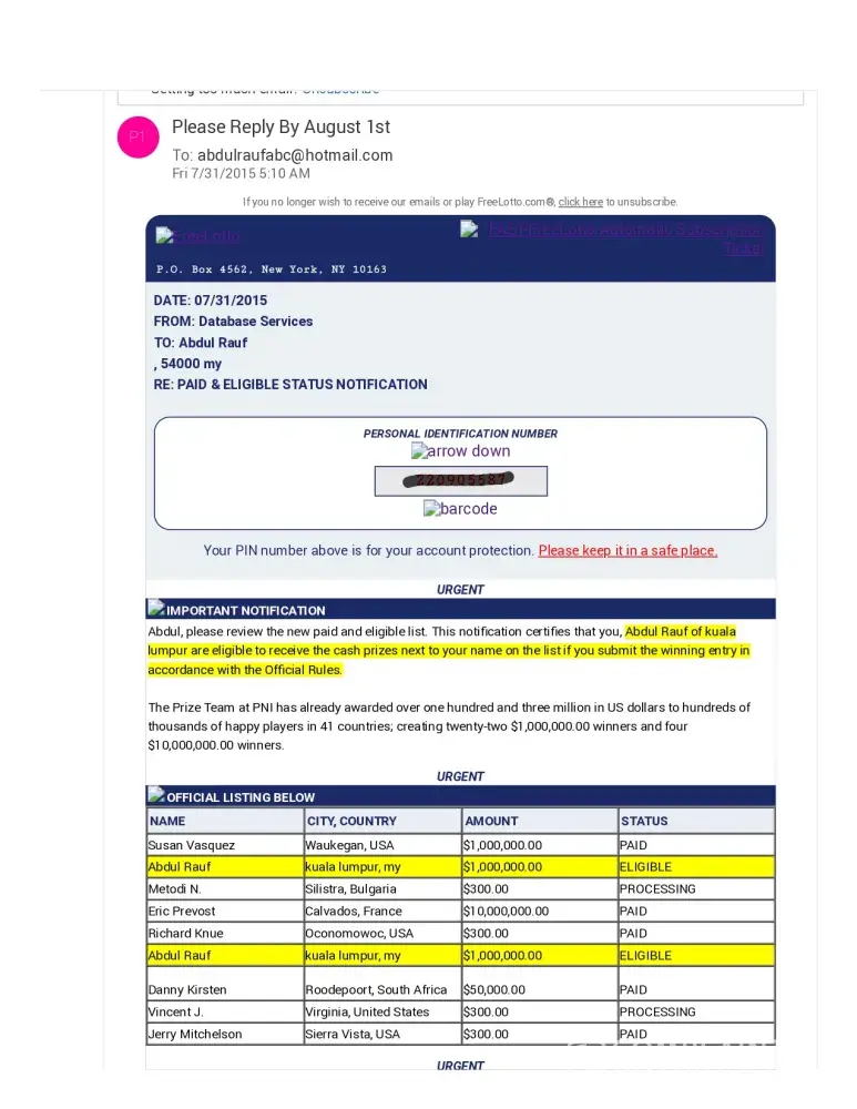 The Prize Team at PNI has already awarded over ninety-nine million in US dollars to hundreds of thousands of happy players in 41 countries; creating twenty-one $1, 000, 000.00 winners and four $10, 000, 000.00 winners. PNI, a sponsor of online sweepstakes, gives away awards of amounts up to ten million US dollars daily. If your name is on the list below, and you submit the winning entry in accordance with the Official Rules of FreeLotto, you could receive a call from our Prize Team letting you know that you are our newest jackpot winner.
