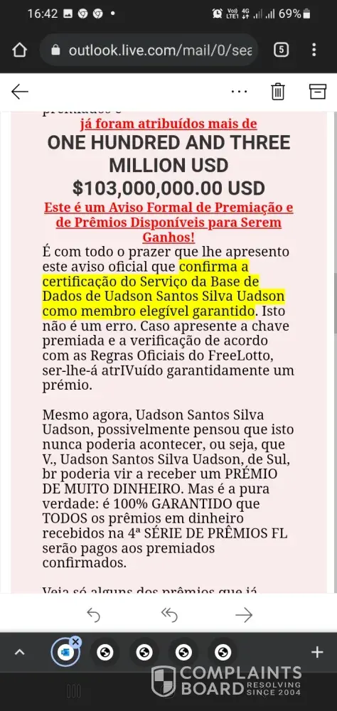 O Free Lotto disse que eu ganhei 3, 000, 00 - tres mil dólares, e até agora não tive notícias seiblitz@hotmail.com