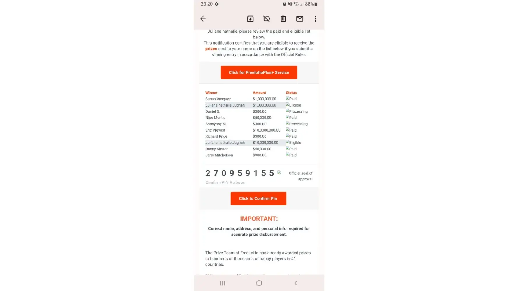 Michelle, because you are on the Paid and Eligible list above, your next step is to verify your PIN # on the following page. It assures you that if you submit the winning entry in accordance with the Official Rules of FreeLotto, using the convenient F.A.S.T. service or the free online entry method at FreeLotto.com, Michelle Thompson and only Michelle Thompson will be paid $1 Million (One Million US Dollars) in the Classic FreeLotto Game or other prizes.