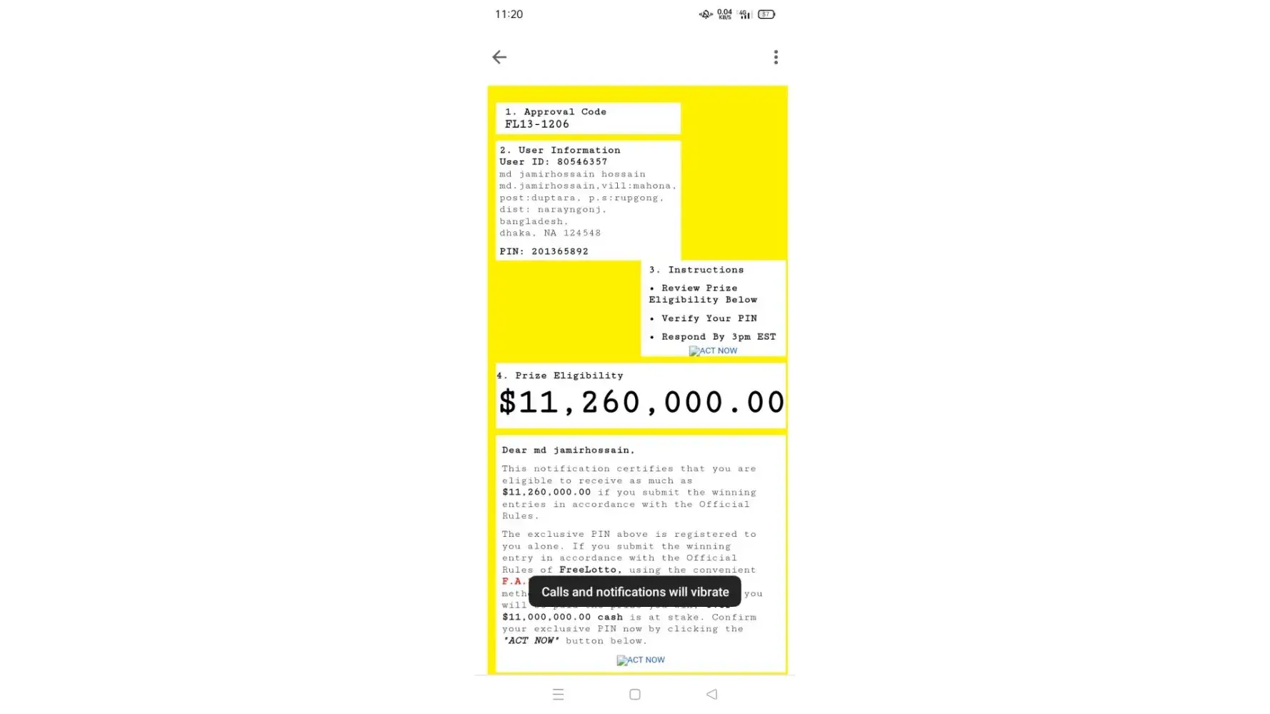 Dear sir,madam, my name is MD jamir hossain, I am big winner free lotto award series I,II,IV eligibility winner in free lotto, please check the list below to confirm prizes, database record no [protected] pin cord [protected]. eligibility winner free lotto date 11-23-2016, please check the my winners prizes, my email: jamirhossain816@gmail.com , thanks you