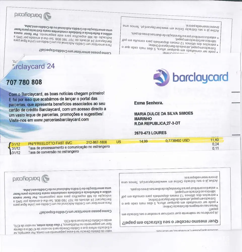 I noticed that I withdraw from my credit card bill every month the amount of € 14.99 which add to the costs of exchange PNI * FreeLotto FAST SVC [protected] U.S., but to which I am unaware of having joined this game, much less monthly. I want it made ​​the cancellation of direct debit in the account on my credit card straight away contacted my bank and they told me that it is only possible through their FreeLotto, but I get no response.