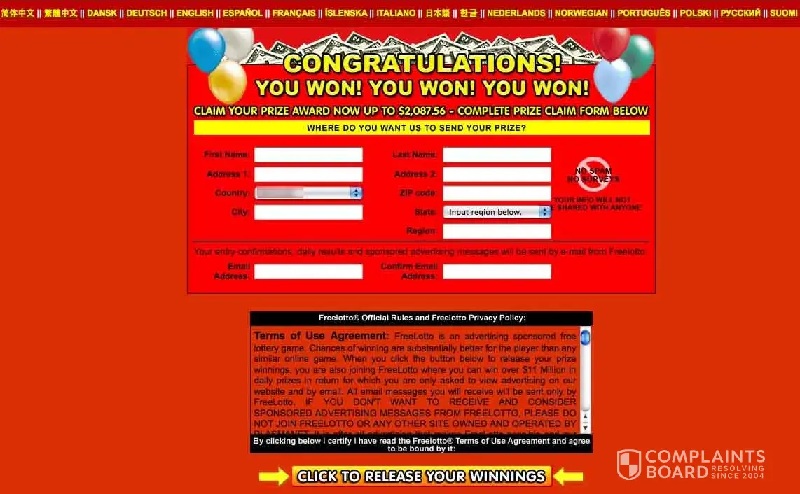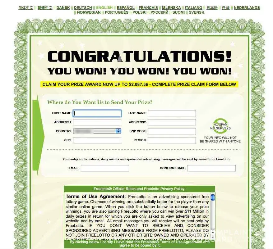 FreeLotto uses false advertising to scam innocents into thinking they've won initially around $2, 000 then once they get you to give them your details they email you authentic looking crap listing your name as a multiple winner - it's a ploy to get you to sign up for their scam - then they take $9-$14 bucks from your card and you cannot get them to stop unless you cut up your card. The worst is that they prey on children oriented websites - shameful! They should be banned from the www.