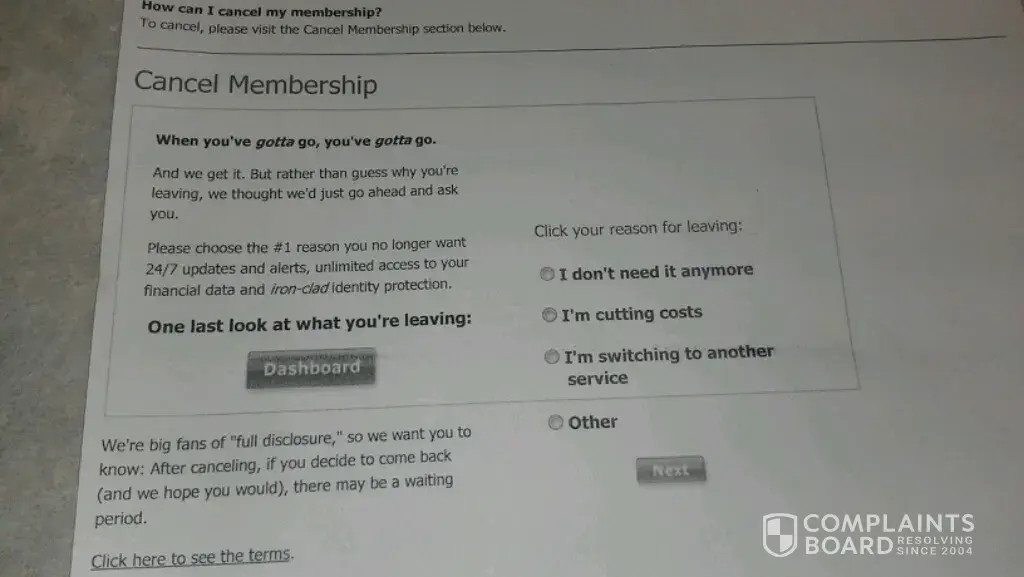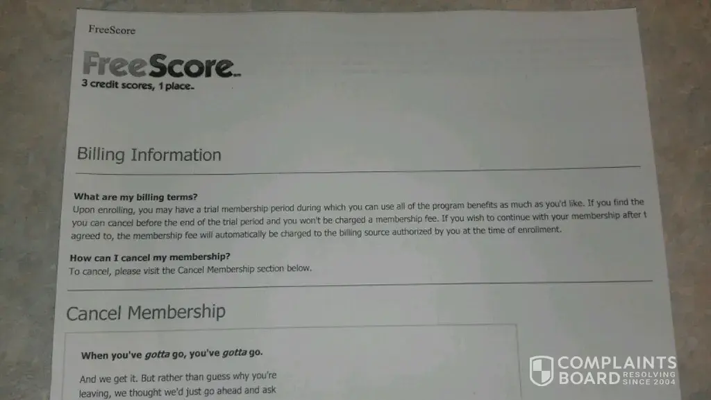 Went to "cancel membership" page prior to my trial membership ending and followed their directions however I was still charged three days later when the trial offer was over. When I called they refused to refund me stating that I didn't follow instructions correctly. They then stated I couldn't cancel online the only way to cancel is to call in and speak with a rep. They make their customers jump through hoops and use word trickery online to confuse customers so they can say "you didn't follow instructions" and still charge them. That is the only way they make their money because their product is bogus and they know it. Below are the pics from their website regarding membership cancellation. However, IT DOES NOT CANCEL YOUR MEMBERSHIP. Freescore.com is a scam artist.