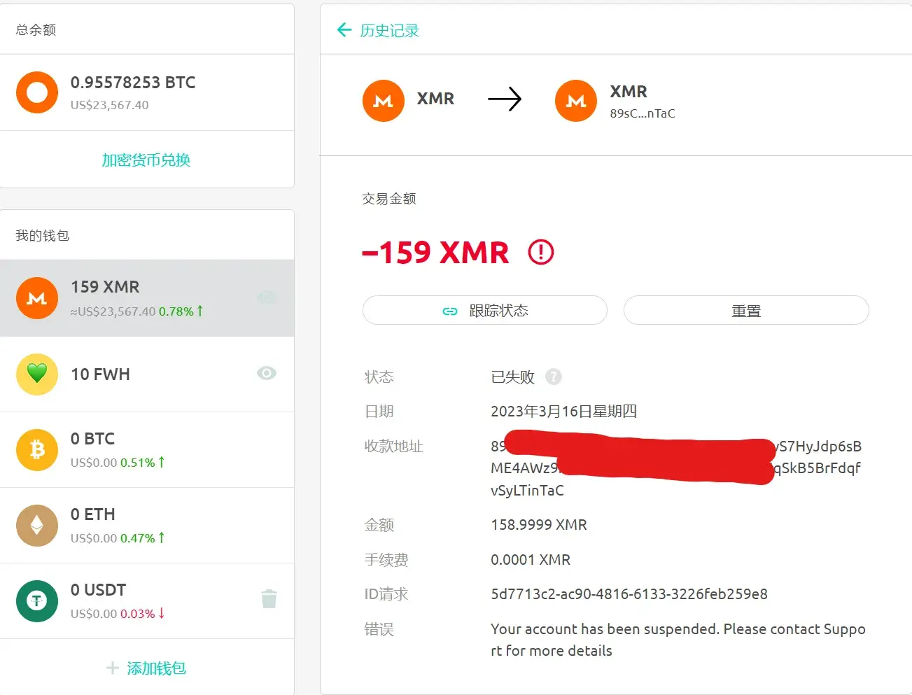 I exchanged some bitcoin into xmr and was sending it off the wallet until the last of it was suspended with nearly $60k now sitting there without the ability to move it. I sent in my verification picture, ID and bank statement. Contacted through telegram, email and twitter and have not gotten a response. It’s messed up because I need that money now. I can’t have it just sitting there stressed out hoping someone gets back to me and it gets released someday. Ticket number 464277