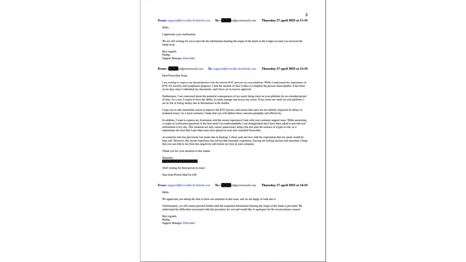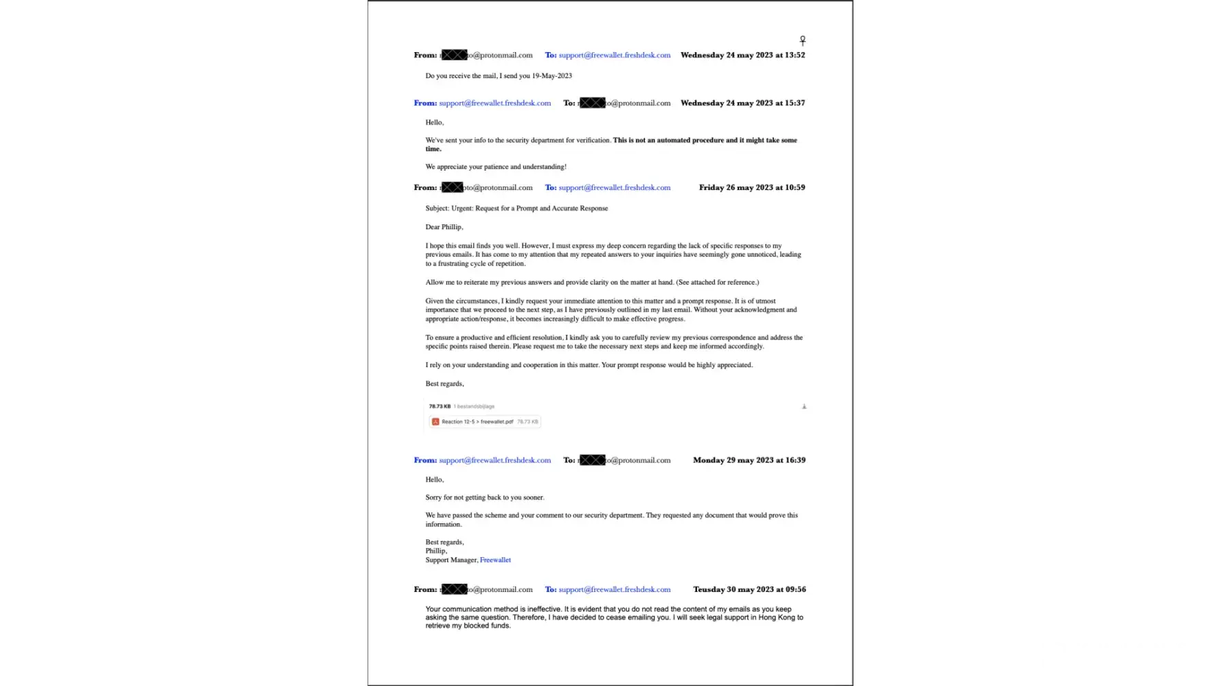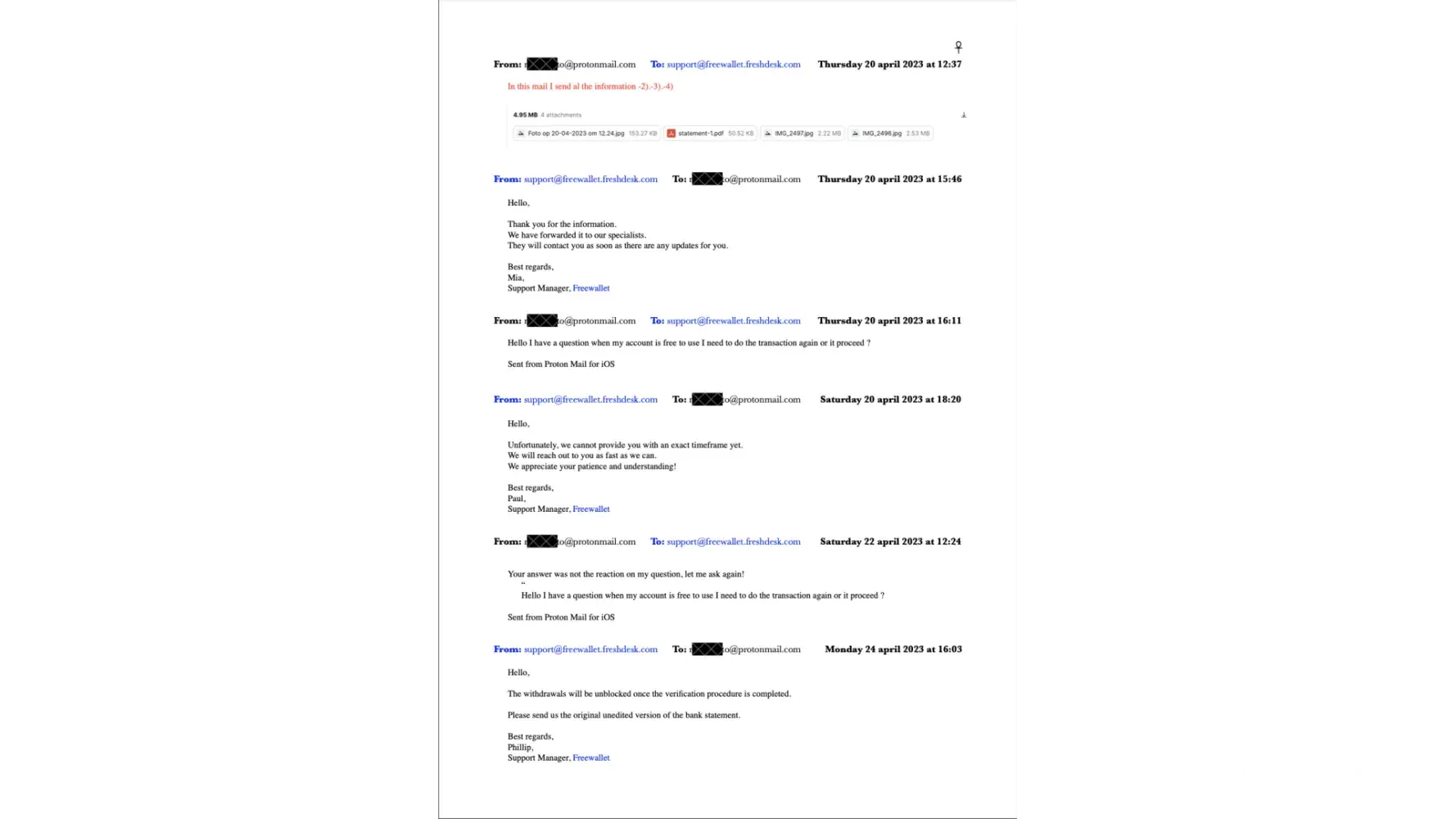 Since 20th April 2023, I have received 23 emails and sent 24 emails to support@freewallet.freshdesk.com. Until today, I haven't received any support ticket. Just now, on 4th July 2023, at 14:41, I emailed again, asking, "Can you give me a support ticket number for this case?" If you put in more effort, you could also find the case in the 10 screenshots that I have attached to this complaint.