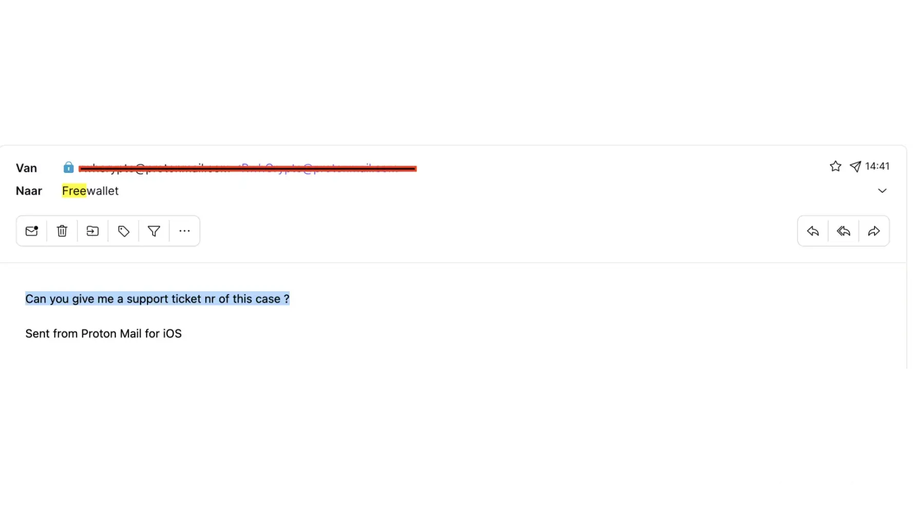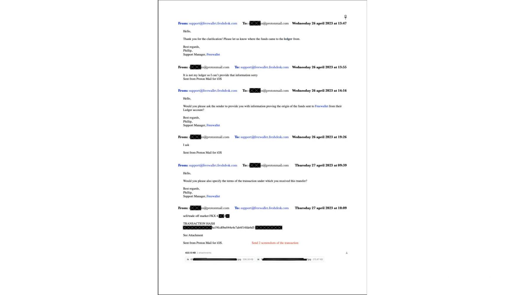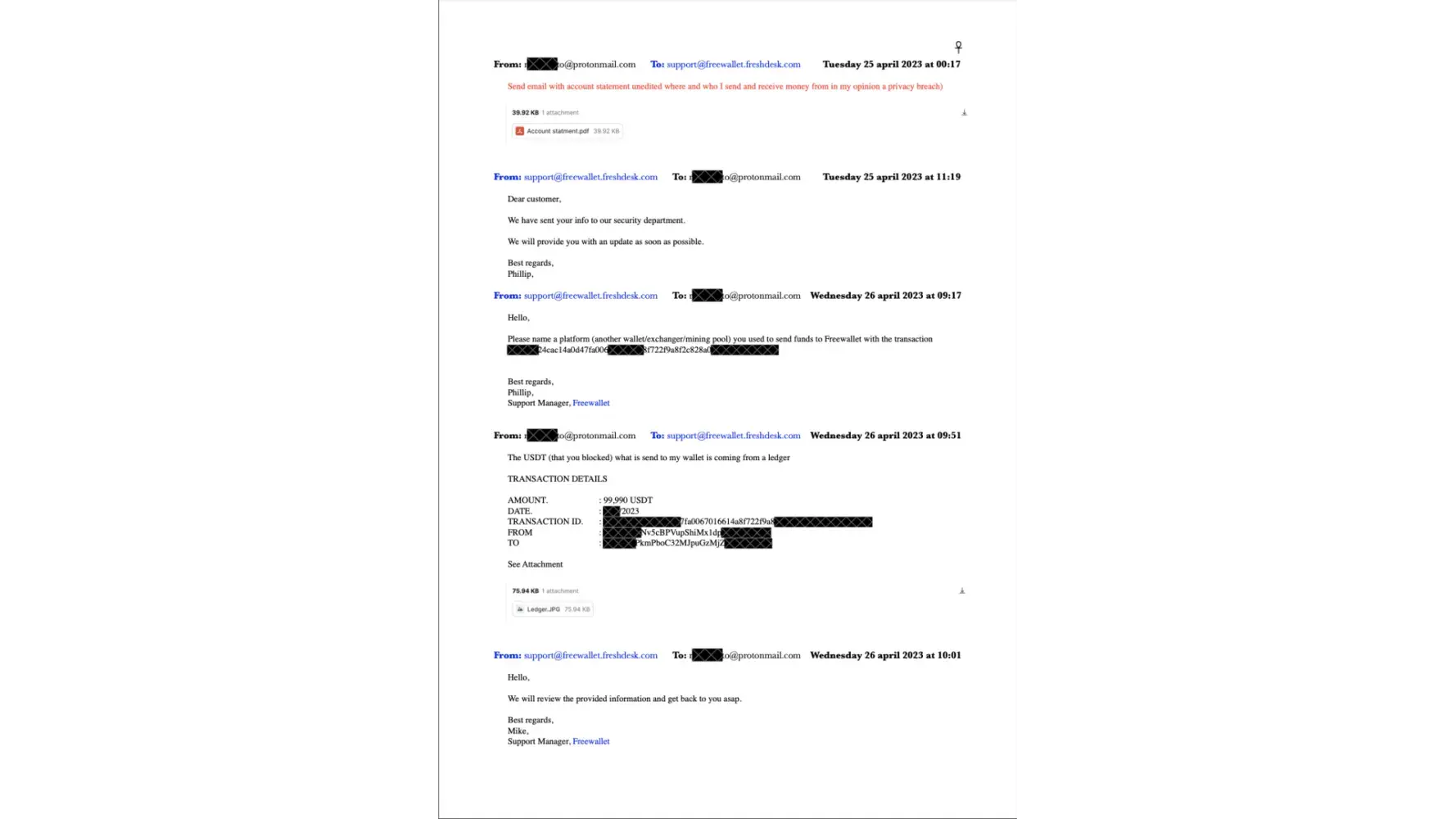 Since 20th April 2023, I have received 23 emails and sent 24 emails to support@freewallet.freshdesk.com. Until today, I haven't received any support ticket. Just now, on 4th July 2023, at 14:41, I emailed again, asking, "Can you give me a support ticket number for this case?" If you put in more effort, you could also find the case in the 10 screenshots that I have attached to this complaint.