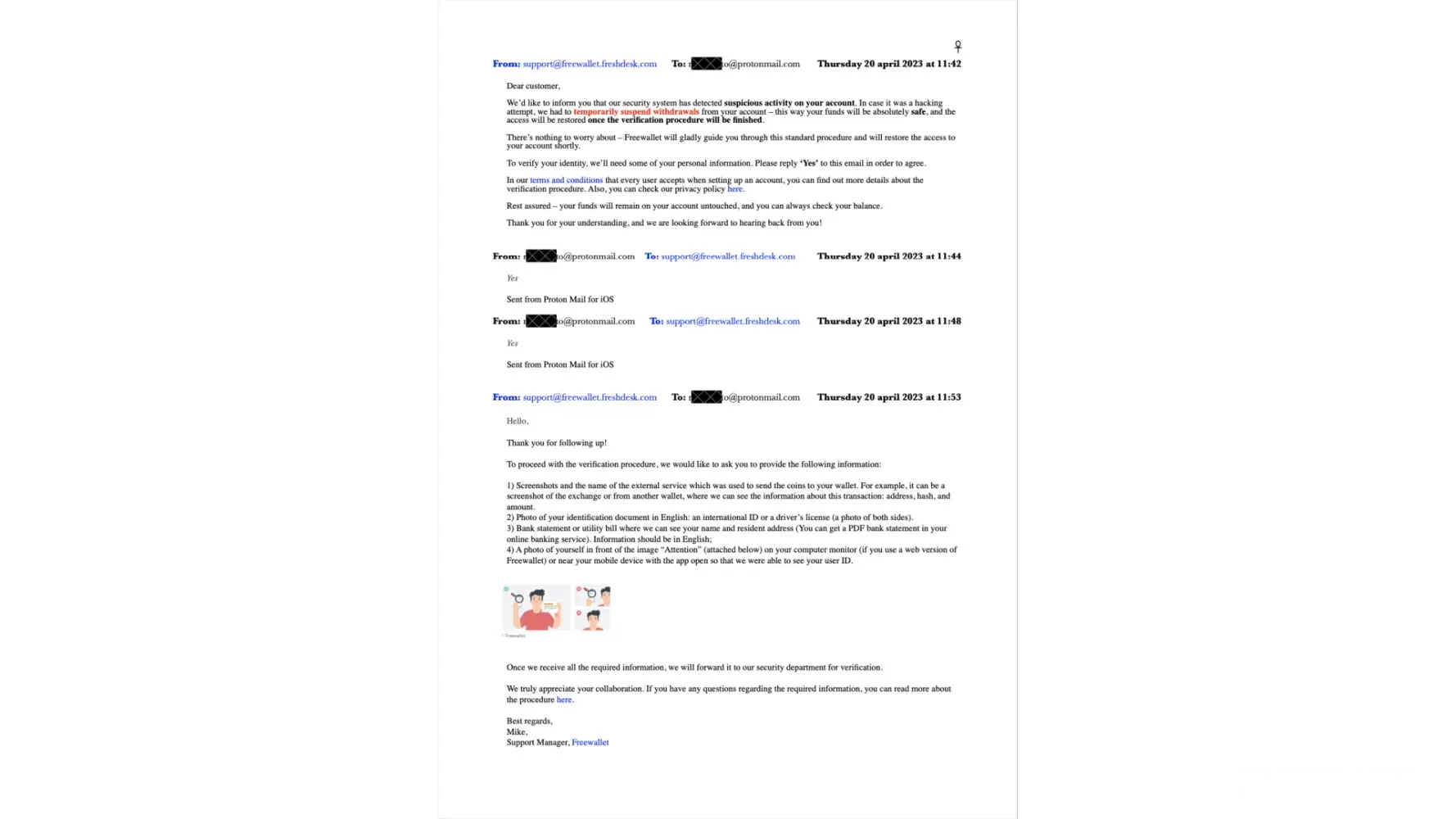 Desired outcome: To please get my email changed to my actual email. Not an Email FreeWallet created to sign up my account I have never heard of. I emailed docs asked for from [protected]@protonmail.com