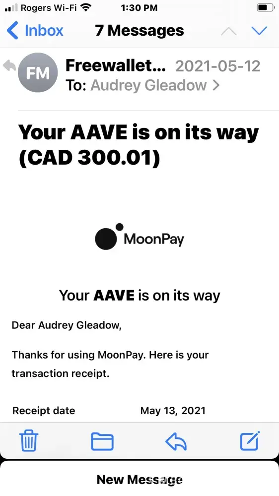On May 12, I purchased AAVE from inside Freewallet, I have included the screenshot inside Freewallet and AAVE is listed as one of the available cryptocurrencies to purchase, the POS processor was Moonpay. Moonpay confirmed the money was sent. After I purchased it, I went to look for it and there was no AAVE wallet in the app. I alerted Freewallet support and a few days later the wallet was added, but no AAVE in my account. When I contacted support they said the problem was temporary and that I soon would receive my coins, my acct is 2cc9b1c4. I have emailed numerous times but never speak to a live agent only bots, it is a month now and my purchased coins have not been deposited. When I contacted Moonpay about it I was told Freewallet would be able to help me retrieve the coins. The amount to deposit is $245.67 which is the $300.01 minus the processing free.