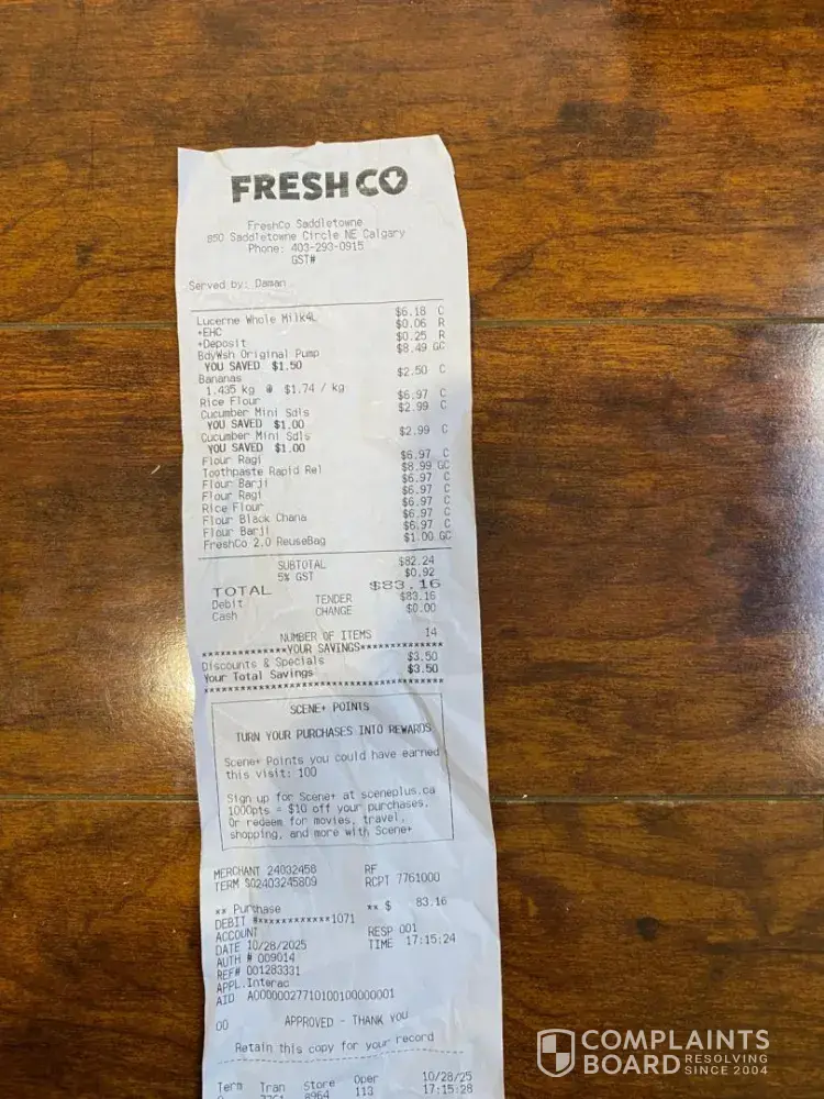I purchased a pack of Compliments Mini Cucumbers from the FreshCo in Saddletowne on October 28, 2025.
