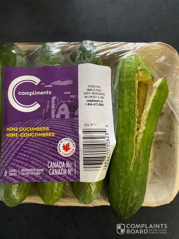 When I opened the package to eat, I was very disappointed to find that one of the cucumbers was damaged and looked spoiled (photo attached). Canada is already very expensive, and I spend my hard-earned money expecting good-quality products. It’s frustrating to receive poor-quality produce.