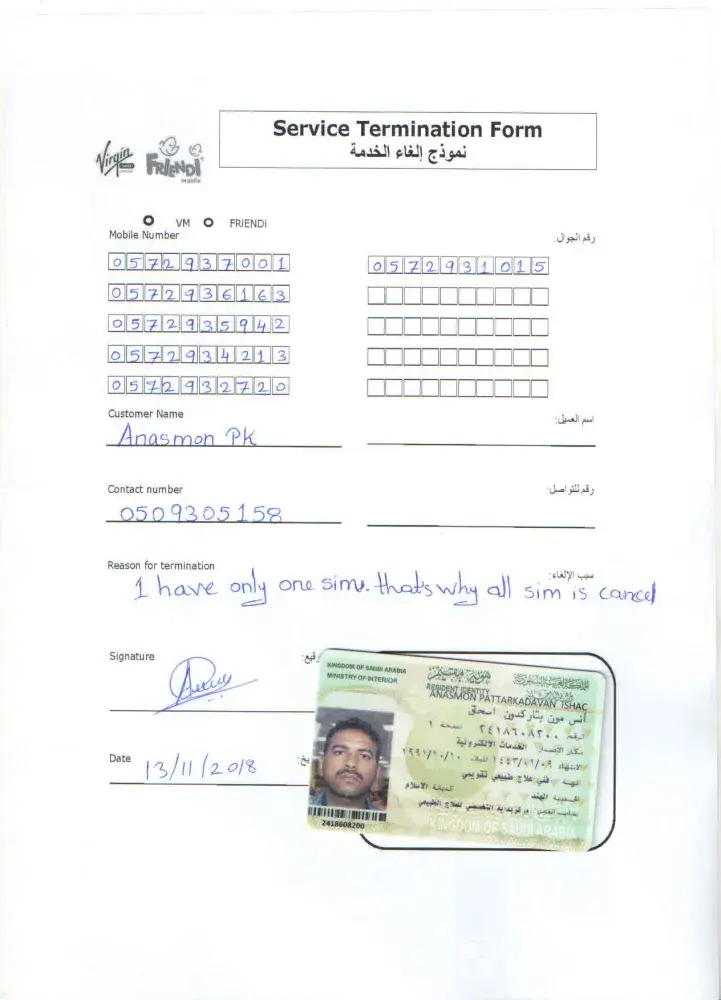 Dear, at first I'm using 1 friendi sim card..but blocked in friendi sim card.. so I want to deactivate friendi sim card from my iqama... so please deactivate all friendI sim my iqama number [protected].