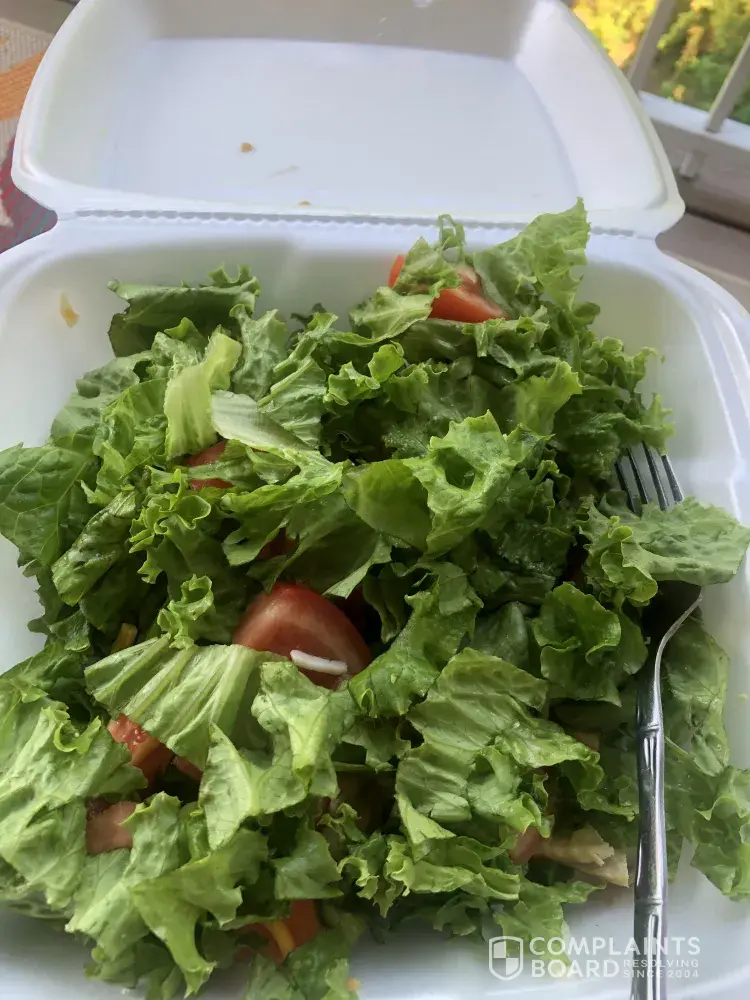 My daughter and I ordered food for delivery. My 11.00 salad I ordered had on 3 strips of chicken (dried out) old tomatoes, melted cheese and lettuce. I had to throw out the tomatoes and cut my own. The quality of the chicken what little of it there was was horrible. Very disappointed this salad was 11.00!