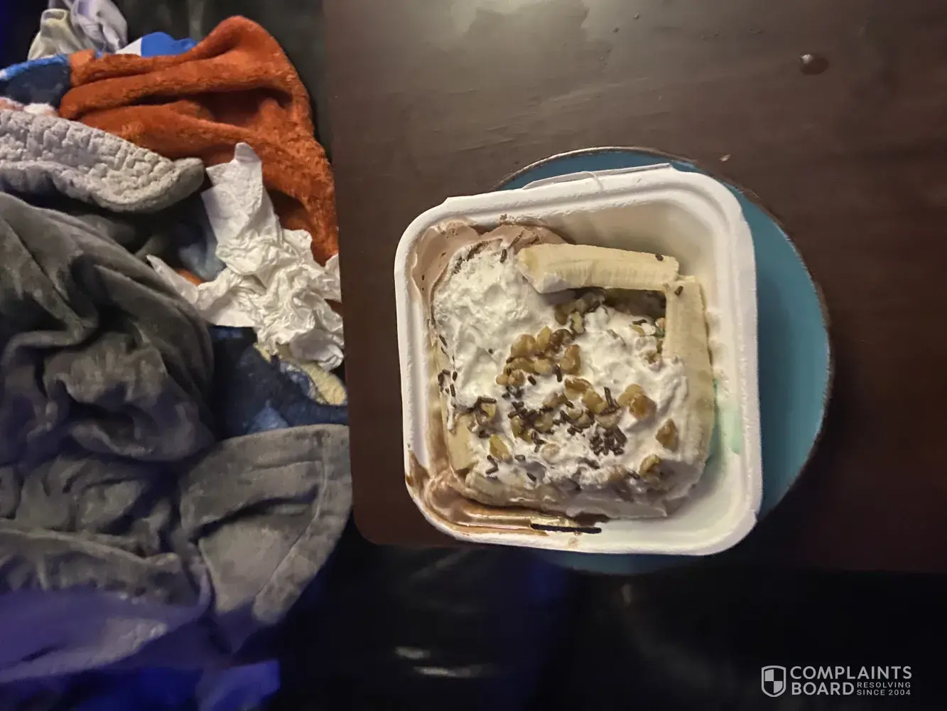 This is my $15 banana split I received from door dash tonight from Friendly's in Attleboro ma I was extremely mad and disappointed that they would ever send it this way look at the small container that spilled everywhere in my house it is not meant for ice cream at all it is a container for food and it is so small I have never got a banana split this small in my lifetime.