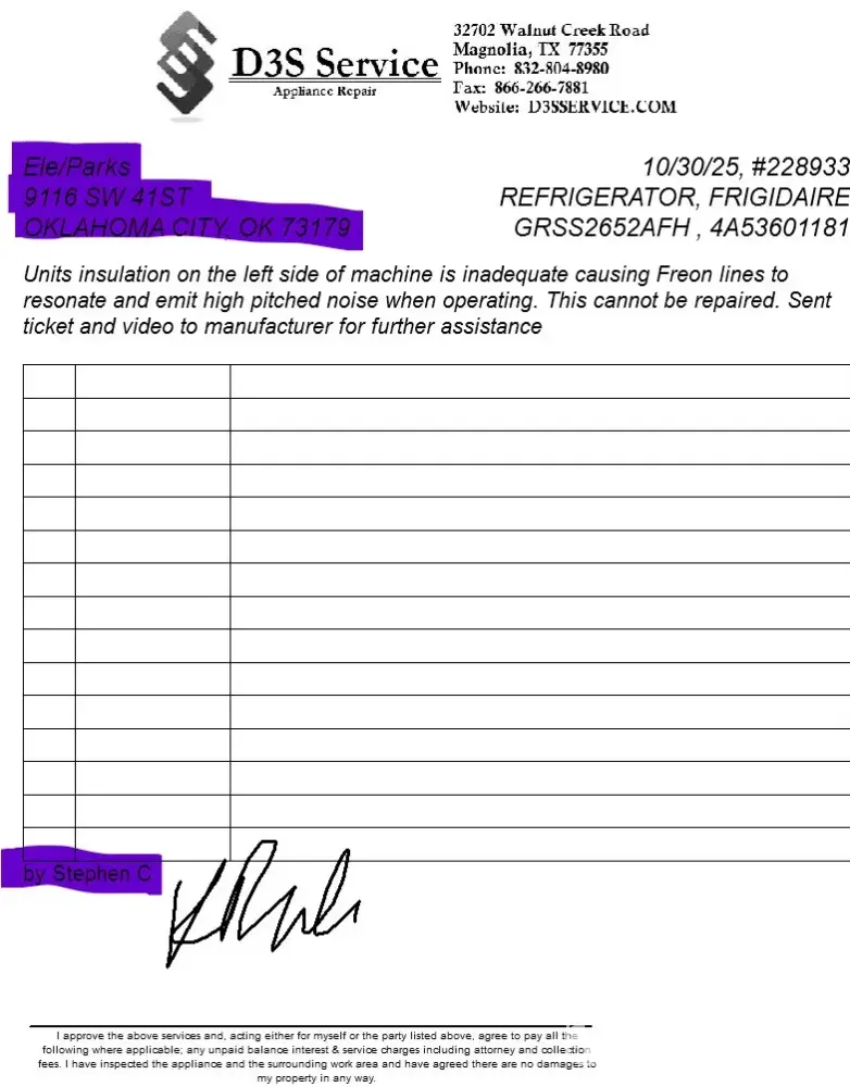 Purchased a Frigidaire side by side 12/2024 in August 2024 it began sounding like a jet taking off. Contacted Frigidaire and they sent a repair person of their choosing. After sharing the video of the noise he made no recommendations other than it might be the ice-maker and not to let anything near the vent and said he would get it replaced. After 14 month...