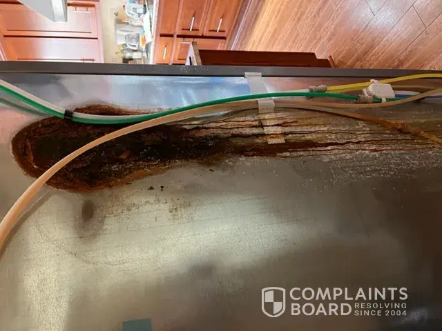 No water or ice from dispenser, we pulled the refrigerator from the wall and discovered the water line and ice maker lines on the back of the refrigerator created a big block of solid ice. And the back panel of refrigerator is rusted out. Sent 3 emails to [protected]@frigidaire.com and [protected]@electrolux.com with pics. No response. Told I had to schedule technician to come out for $79.99 to diagnose the problem. First appt on 12/22/22, no word. Called back and got rescheduled for 12/28/22. Technician told us this problem is rare and we were assigned a file #[protected] and to call customer service. Got no where.