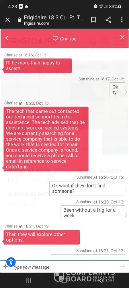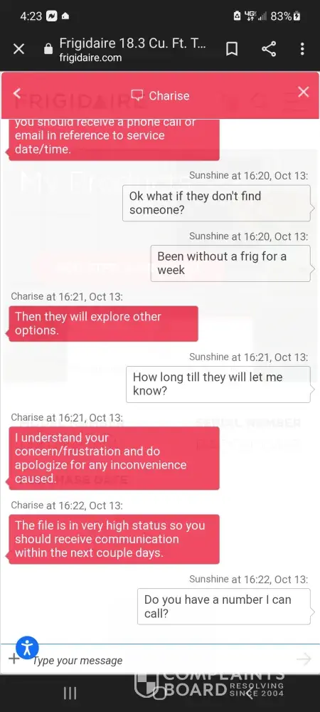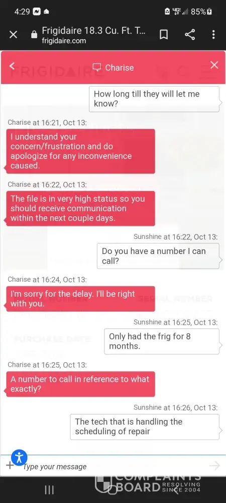 Chatted with Frigidaire customer service on 10/7/21 about my frig and freezer not getting cold. They sent a tech out on 10/12/21. Tech could not fix compressor that locked up because he does not have the tools for it. He called Tech Line and gave me a file # [protected]. Repair guy said call them if you don't here anything by 10/13/21 in the afternoon. I called the 800 number listed on site, waited 28 minutes to speak to someone who said she couldn't help. I got on site chat. Chat hist told me they where looking for another repair company and to give them 48 hours. She said there is no one I can speak to. I just have to wait for them to call me. It has been a week and still no repair or replacement if an 8 month old refrigerator.