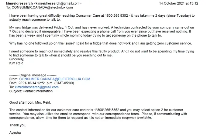 A new fridge was delivered to my home Friday, 01 Oct 2021. We noticed it was not cooling and reached out to Frigidaire Canada (Electrolux Canada)on Monday, 04 Oct 2021. They sent out a contracted technician on Thurs., 07 Oct 2021 and he determined that there was an unrepairable internal leak that was likely due to a faulty weld. Since the technician's visit, I have not heard from Frigidaire. I finally got through to their Customer Care line on Thurs., 14 Oct 2021. The representative stated that they had not received the report from the contracted technician but she would follow up. It is now Tues., 19 Oct 2021, and I still have not heard from Frigidaire. I have been without functioning fridge for 19 days, and I have no idea what to do about it. I paid for this fridge in full and it is a faulty product, but Frigidaire has not contacted me once despite multiple efforts. I have attached the email I sent on Thurs. 14 Oct 2021. I received an automated response stating they had received my email and would respond (they haven't). I sent another email today (19 Oct 2021) and received yet another automated response. I also tried to call Customer Service today (19 Oct 2021) but have been unable to reach anyone - not even to leave my number for a call back.
