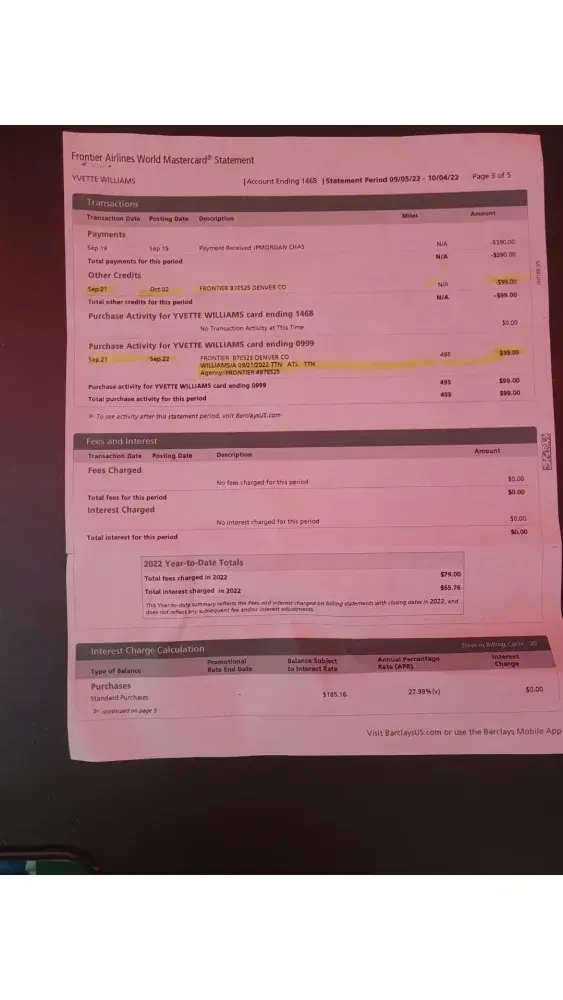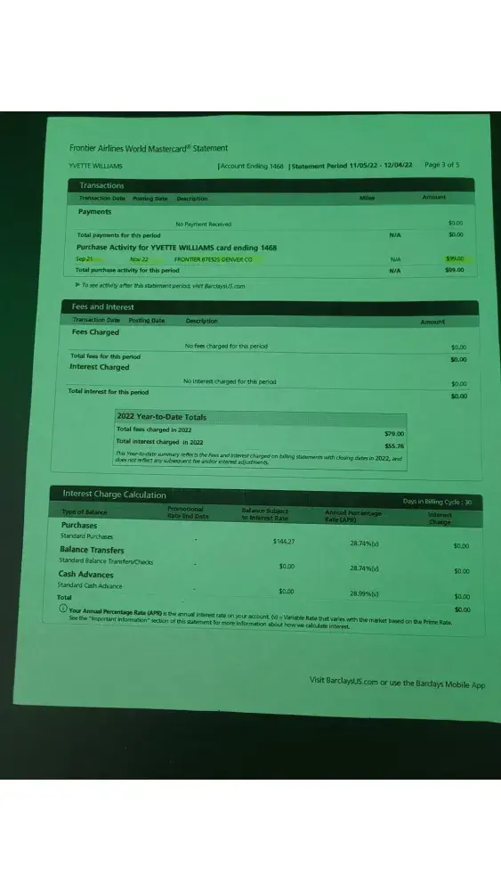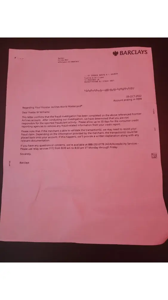On September 21, 2022, in connection with my travel on Frontier Airlines en route from Trenton Airport, (Trenton NJ) to Atlanta International Airport, (Atlanta, GA), as I was about to board the plane, I was advised by a Frontier Airlines Agent that I had to pay a carry-on baggage fee of $99 because my personal item exceeded the size restrictions. I provided the Frontier Airlines Agent a bank debit card for the charge of $99 and it was approved and debited. I later discovered on or about September 26, 2022 that Frontier Airlines had charged $99 to my Frontier Airlines Mastercard. Immediately I contacted Frontier Airlines Mastercard (Barclays) to refute the charge based upon fraud and I closed the credit account. On October 5, 2022, Barclays issued a letter indicating that its fraud investigation was completed and that I was not responsible for the reported fraudulent activity.
