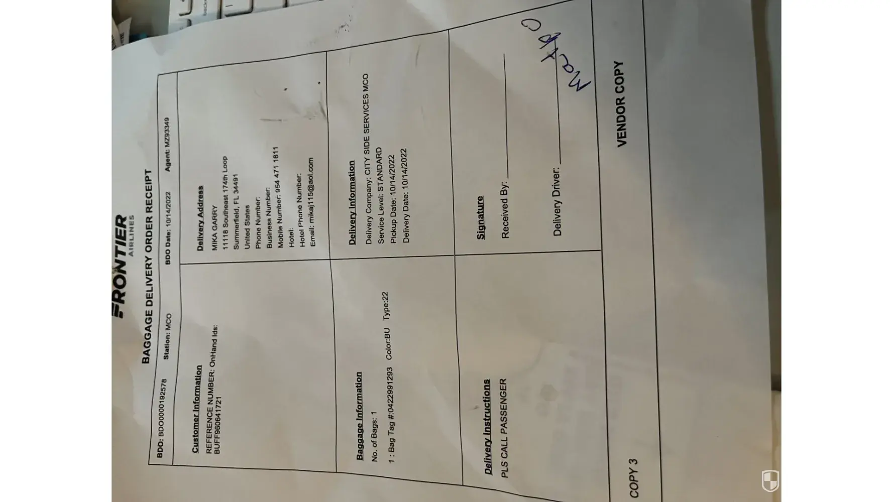 from the Orlando airport. Imagine! I said, pls deliver my bag. On Oct 14 they delivered my bag.