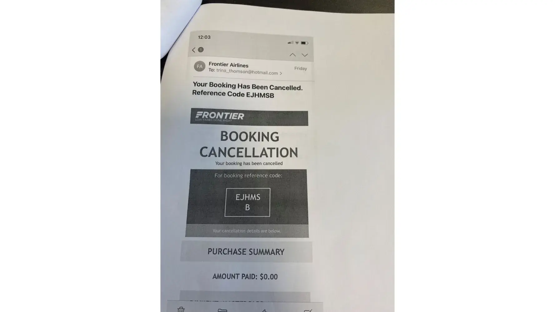 Frontier Airlines reimbursed cancelled trip