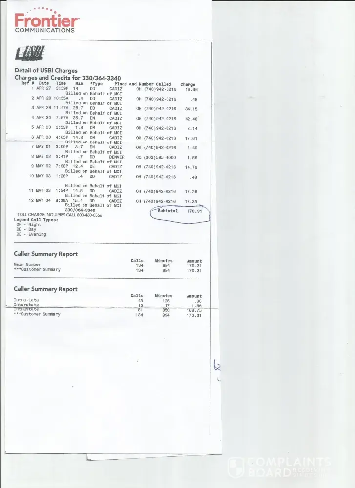 I was billed on my July Frontier bill for calls made in April and May to Cadiz, Oh from a company called USBI. I have unlimited long distance on my phone plan. I am not sure what kind of scam this company is pulling but I am not falling for it. Frontier removed the charges from my bill but I feel this is something that needs looked into.