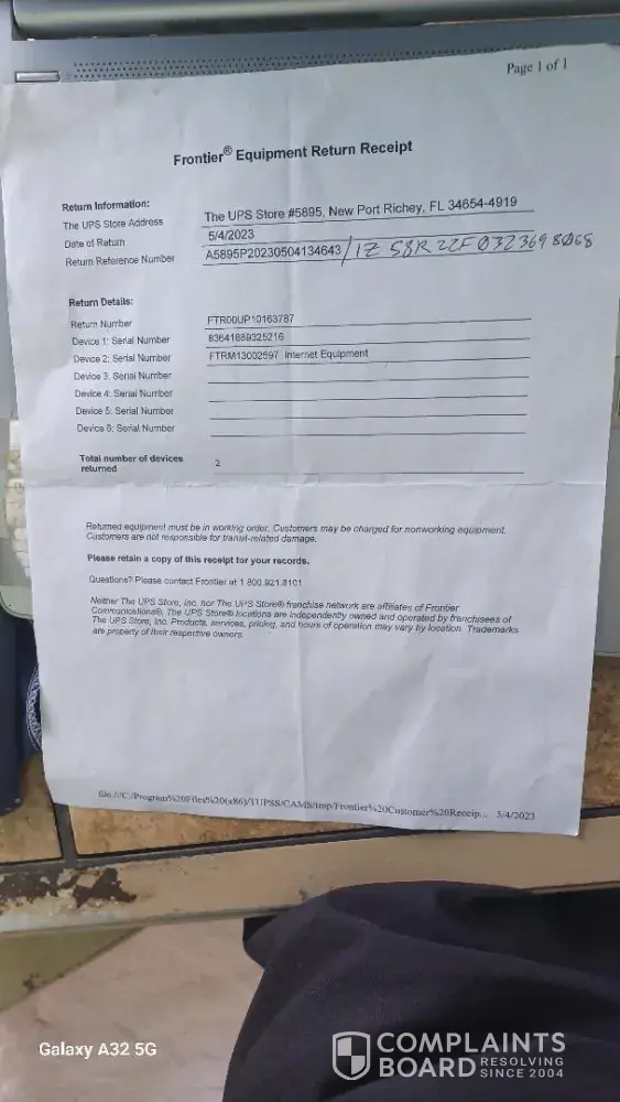 I have returned my equipment to Frontier and do have a receipt from UPS. they are refusing to take the charges of 107.00 off of my account. I have called them multiple times and they told me that it would take 24 to 48 hours to remove the charges, as they verified that the equipment wad returned. They gave me a case number; #[protected]-5. The charges are not taken off of my account. My name is Barbara Nuckols. 7815 Floradora Dr New port Richey Fl 34654.
