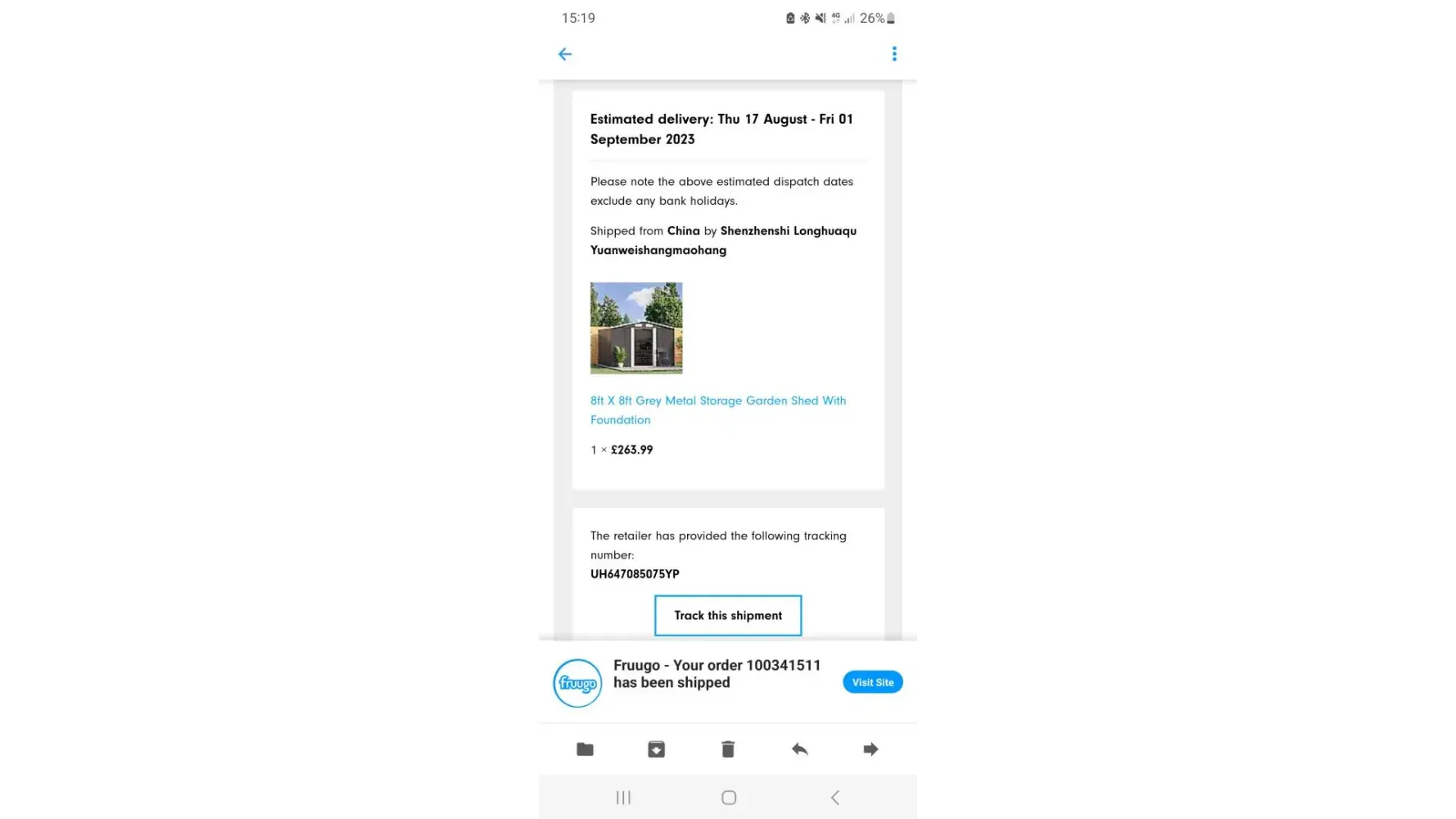 I ordered grey metal garden shed on 15 th August 2023 ,now a month is gone , last delivery date was 1 st September, still im waiting. Now its too late .I send so many emails about update but no response. Now I want to refund my money back.