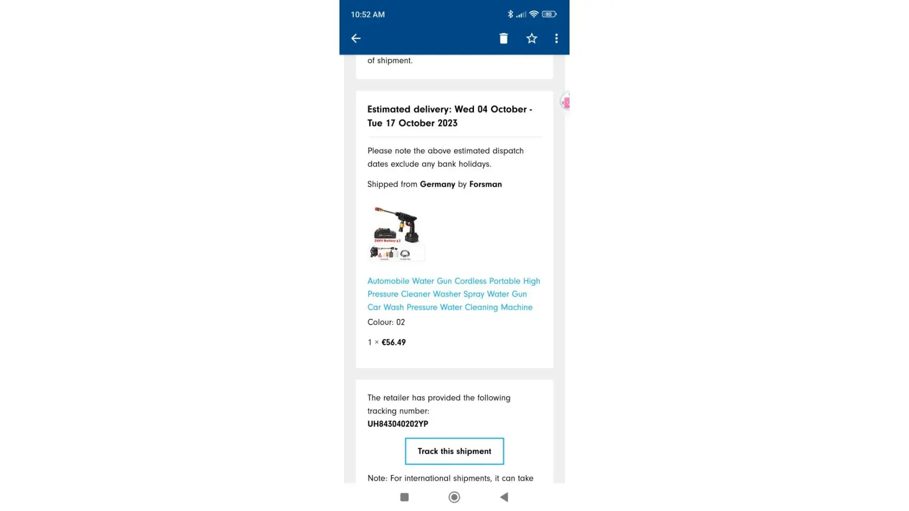 Paid for the item and got tracking advise and the order still says shipped 06.10.2023. Contacted the helpdesk with a lady Nichole p replied back with tracking number. Contacted again with no reply. Spend almost R450 on the items which is now lost and forgotten.