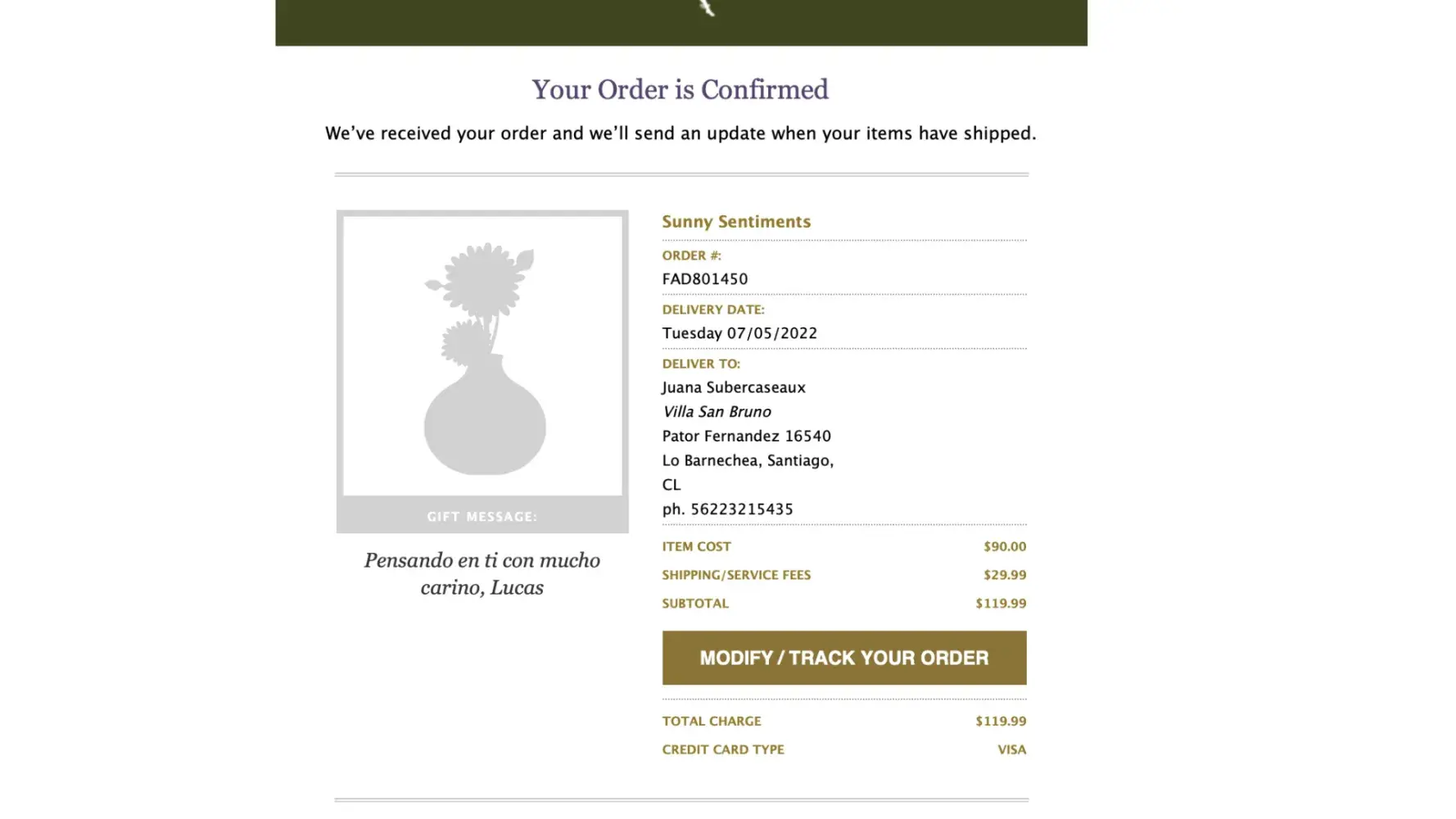 January 9, 2023 FTD.com, FTD, LLC Re: Undelivered flowers for brother's funeral January 7, 2023, Just finding out flowers ordered for brother's funeral last Saturday at noon were NEVER DELIVERED. My phone number, included in ordering details as well as funeral coordinator's number. He also son of. NEITHER of us were called until I got this call today. I called him to update him on this fiasco. You sent emails to me updating me on supposed progress in order. NOT TRUE! Told customer service they had until today to correct this problem. Else, I would be complaining all over the place. Unable to attend in person due to physical handicap and depended on flowers to place hold for me at funeral. That did not happen. No one at funeral was aware of my attempt. Purposely spoke to a live person to order flowers and stress details of funeral date, time, and address potential problems in advance. Did not work out any way. Very distressed and disappointed. FTD Flowers Unsubscribe To: Sat, Dec 31, 2022 at 1:48 PM Your Order is Confirmed We've received your order and we'll send an update when your items have shipped. GIFT MESSAGE: In Sympathy with much love Uncle Le Thoughts of Tranquility Floor Basket ORDER #: [protected] DELIVERY DATE: Saturday, 01/07/2023 DELIVER TO: South ph. ITEM COST $200.00 SHIPPING/SERVICE FEES $19.99 TAX $22.00 SUBTOTAL $241.99 MODIFY / TRACK YOUR ORDER TOTAL CHARGE $241.99 CREDIT CARD TYPE DISCOVER If you have any questions about your order, please contact us. Track your Order 3 Steps to a Great Experience STEP 1: Convenience Home, work, or on the go: FTD is there STEP 2: Freshness Arrangements arrive blooming and ready to glow STEP 3: Reliability Feelings and thoughts are shared without words every time Flowers say it better. FTD says it best. To honor Our Guarantee: o Residential deliveries will be made by 8 p.m. If the recipient is not available at the time of delivery, the florist may leave the item in a safe place for the recipient to retrieve when they return or attempt to deliver the next day. During the holidays, deliveries may be made as late as 9 p.m o Business deliveries will be made by 6 p.m. If the business is closed or not accepting deliveries, delivery will be attempted the next business day o We do not accept requests for delivery at specific times of day o The recipient may be called to schedule delivery o We have a simple goal delight our customers with flowers that are high quality, fresh, and beautiful. While we may occasionally need to substitute for color or flower variety, we promise that the blooms you receive will be fresh and wow you or your gift recipient. Please see Our Substitution Policy GIVE A CALL Unsubscribe To: Sat, Jan 7 at 6:00 AM Hi Dietre Le, Your order of Thoughts of Tranquility for is scheduled for delivery today, January 7, 2023. Click Here to Track your Order. Thank you for choosing FTD. Sincerely, FTD Team GIVE A CALL Unsubscribe To: Sat, Jan 7 at 8:24 AM Hi Dietre we are pleased to inform you that your order for is out for delivery. We will notify you as soon as the order is delivered. Click here to see the latest update on your order. Sincerely, FTD Team GIVE A CALL Unsubscribe To: Sat, Jan 7 at 12:15 PM Order # Has Arrived Dietre Le! Your recent order for was delivered. Thank you for choosing FTD to make every moment special. Click here to see the latest update on your order Does something not seem right? If you have any questions about your order, please contact us. GIVE A CALL To: Mon, Jan 9 at 11:05 AM Order# Dear Dietre, Thank you for your recent purchase. Regrettably, we were unable to complete the delivery of your order due to the time constraints of the funeral service. We apologize for the notification of this inconvenience via e-mail, but we were unable to reach you at the phone number provided. Please reply with a home address for this delivery or to request a cancellation of your order. Sincerely, FTD Yours truly, Dietre le