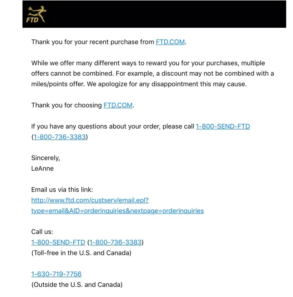 I have ordered a plant from FTD website and received a payment confirmation email and was supposed to receive it the next day. Instead of my plant I received another message that delivery will be several days late. After a week I called and asked about my order and they said that they need more time to deliver. Then I was told that my plant was no longer in stock and was offered a 10$ refund! What a joke! Never again I will order anything from these people!