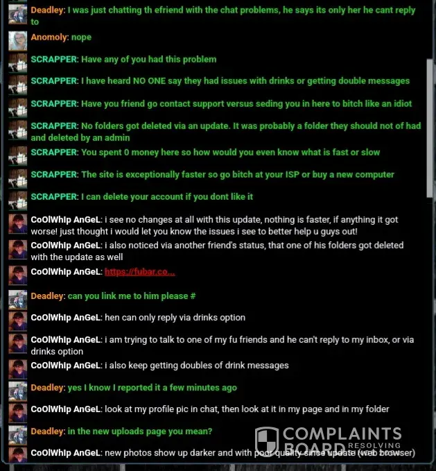 On Nov 5,2024 I purchased 2 VIP starter packs from fubar. $ 7.41 each. On Nov 8,2024 early morning 115 fubar members harrassed me because I said I was anti trump. They called me dirty names, called me and old hag, told me to [censored] off. I fired back at them in my status box. Next thing I know Fubar suspends my account. I confronted Scrapper, explained, and he said he found nothing indicating anyone harrassed me. I told him they and I had deleted their hateful remarks. I put a list of the harrassers in an album, fubar deleted it. I messaged Scrapper a secound time just after a guy buzzkilled me and sent a nasty message, plus told him they were harrassing me via drink messages,etc.. Instead of suspending any of the harrassers Scrapper deleted my account. Fubar didn't refund me my money either. Fubar is wellknown for this type of behaviour. Not fair that I bought on the 5th and account deleted on the 8th.