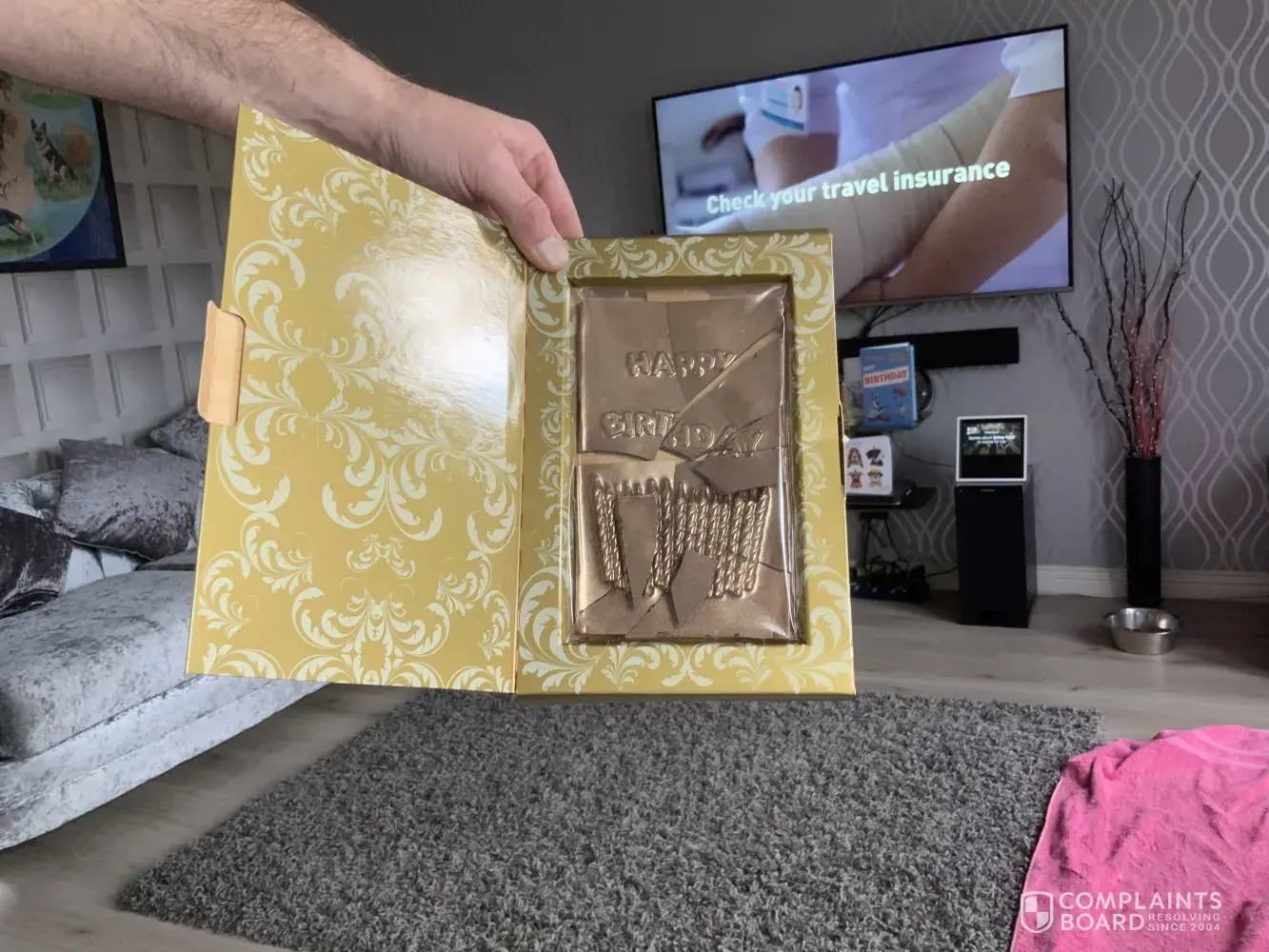 I received my partners chocolate card today and it was smashed to bits I have taken a picture of it if you would like to see how it came I am very disappointed I can not gave this to him as it looks rubbish it was the fist time I had order anything from you and I know the cards were good but if that is the condition the chocolate comes in I won't be getting anymore I have sent you a picture of how it came and the price I payed is not excitable thank you