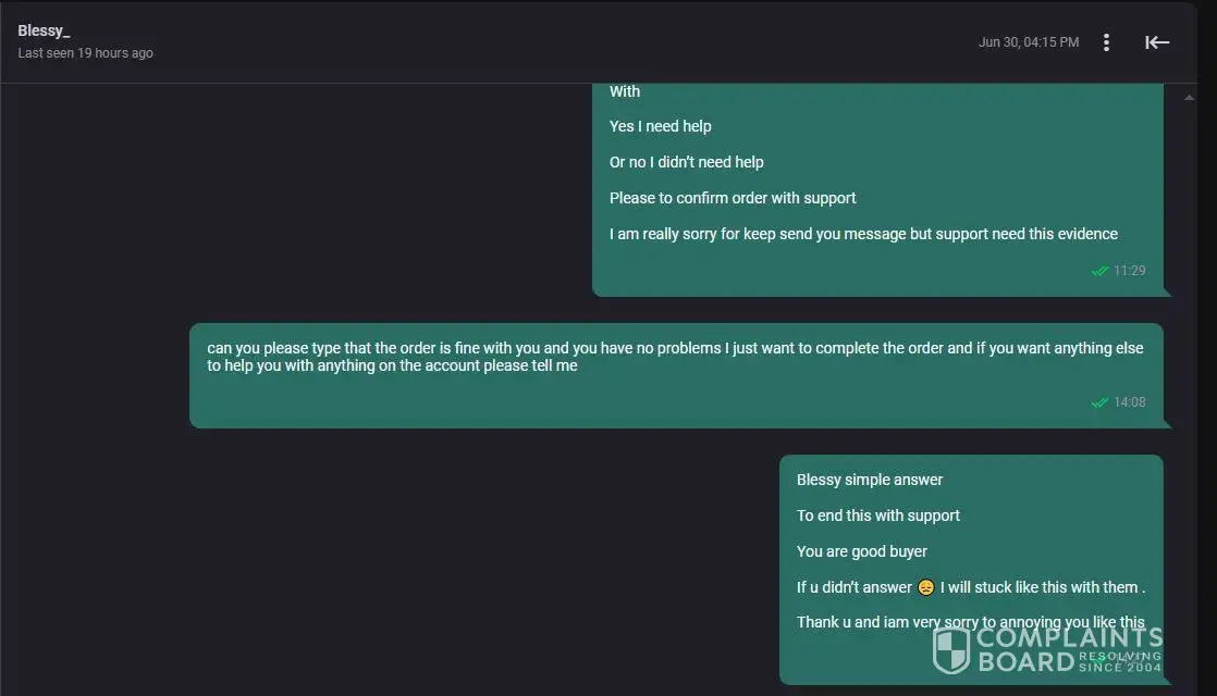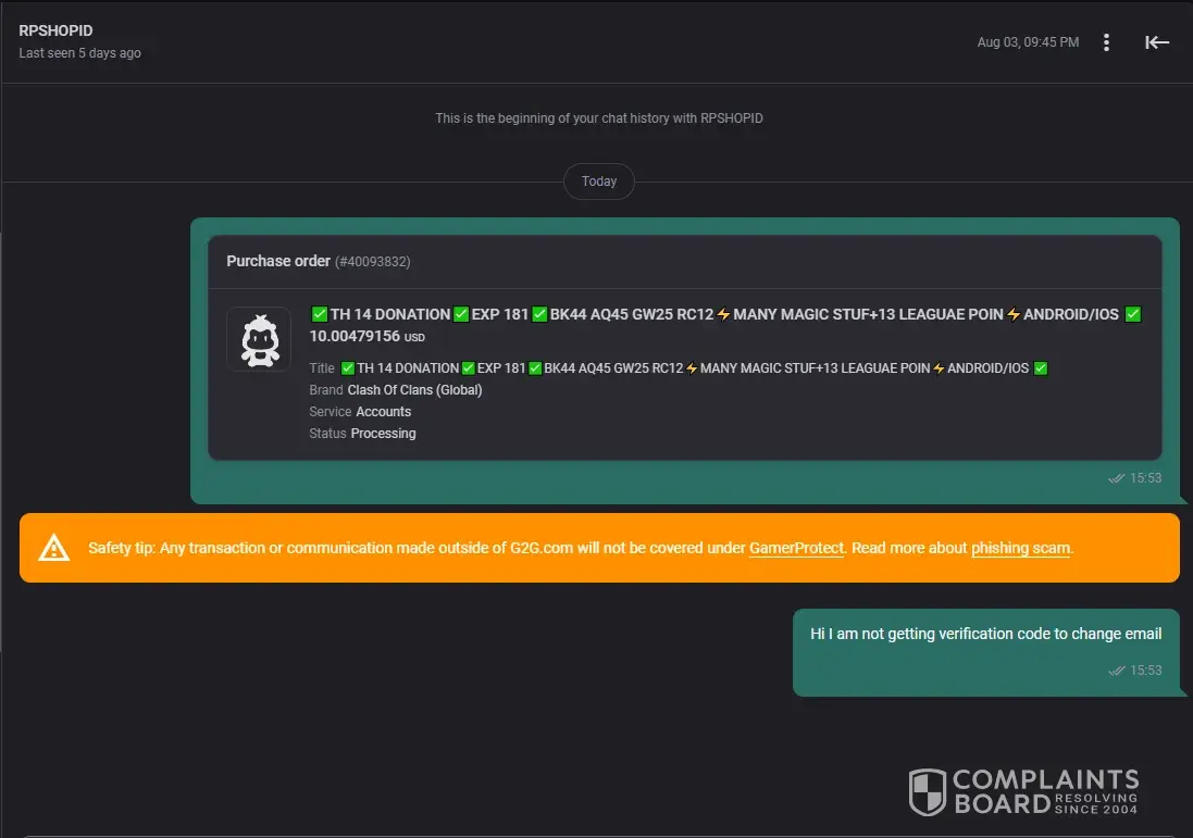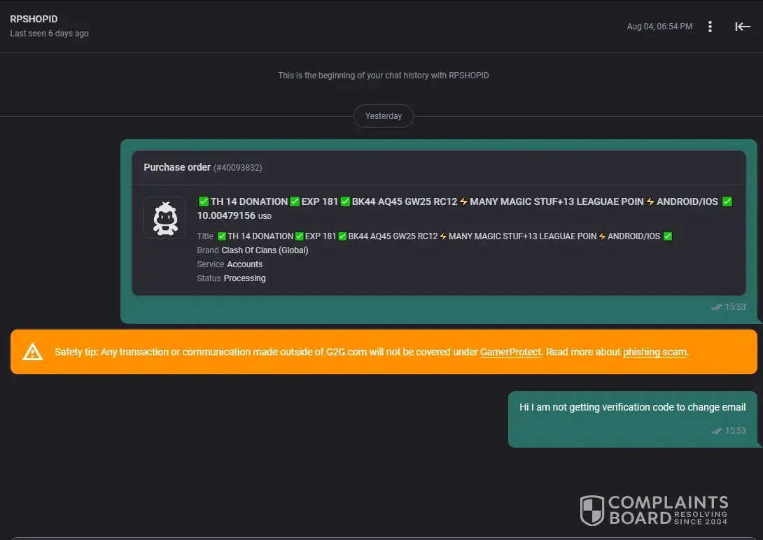 Overall, I learned my lesson not to buy accounts on G2G because of this experience. It's just not worth the risk of getting scammed. I hope that G2G can do more to prevent scammers from using their platform and that they can provide better support for buyers who have been scammed.