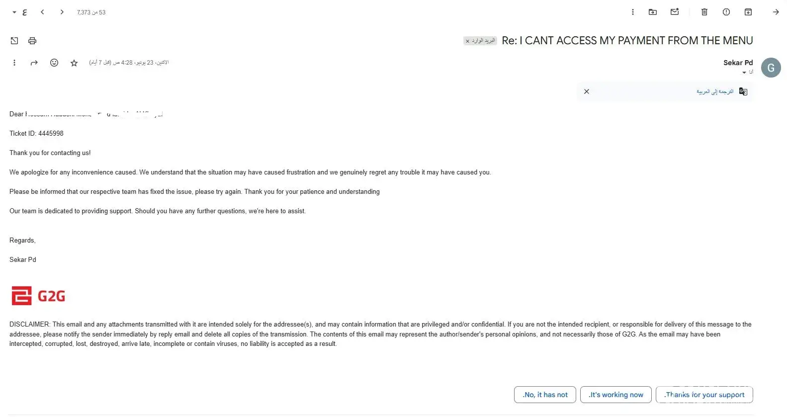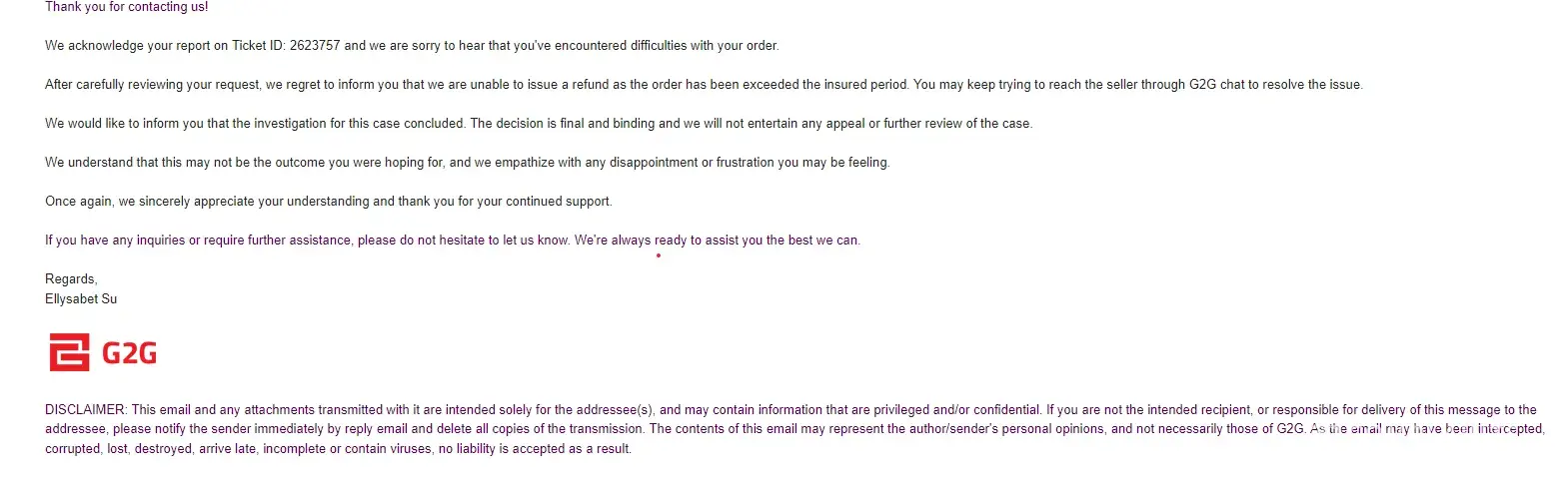 Overall, I was disappointed with G2G's customer support system. They should have informed me about the payment limit before charging me. It's a small thing, but it caused a lot of inconvenience for me. I hope they improve their customer support system in the future so that other customers don't have to go through the same experience as me.