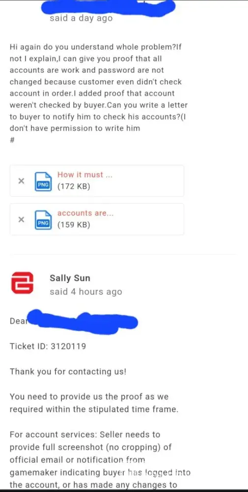 I has been contact for like 10 diferents mail from g2g, already has provide all proof on My hands and nothing is happening, theres just telling send the right info to buyer, so i'm like what's right info if he already have hands on the accounts and all info is by him own now because the accounts was unregistered