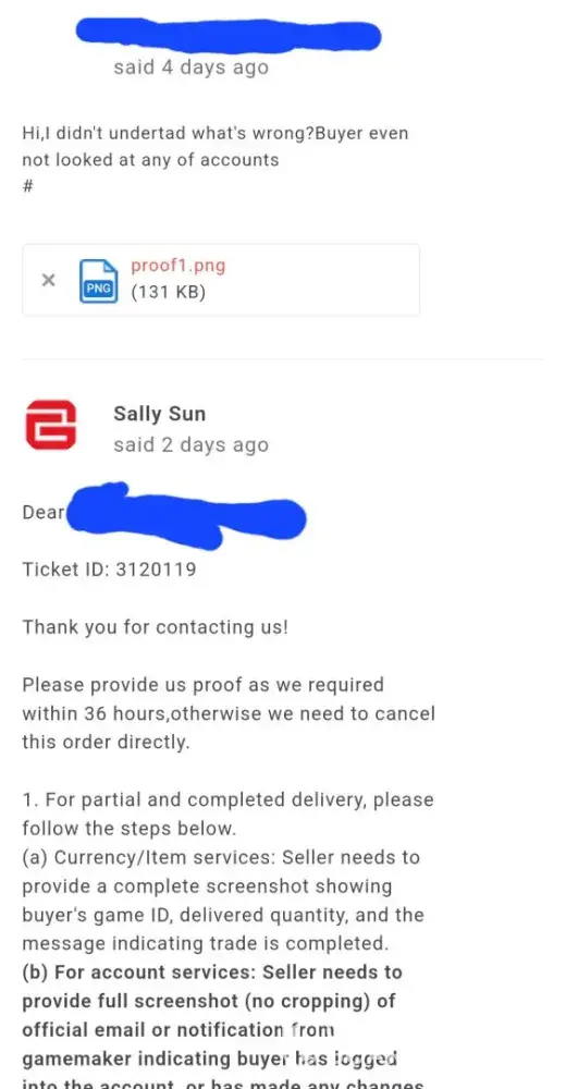 I tried to contact G2G about my situation, but I haven't received a response yet. I sent them a copy of my purchase and the game account information over 5 days ago, but I haven't heard anything back. It's really frustrating to feel like you're being ignored when you're trying to get help.