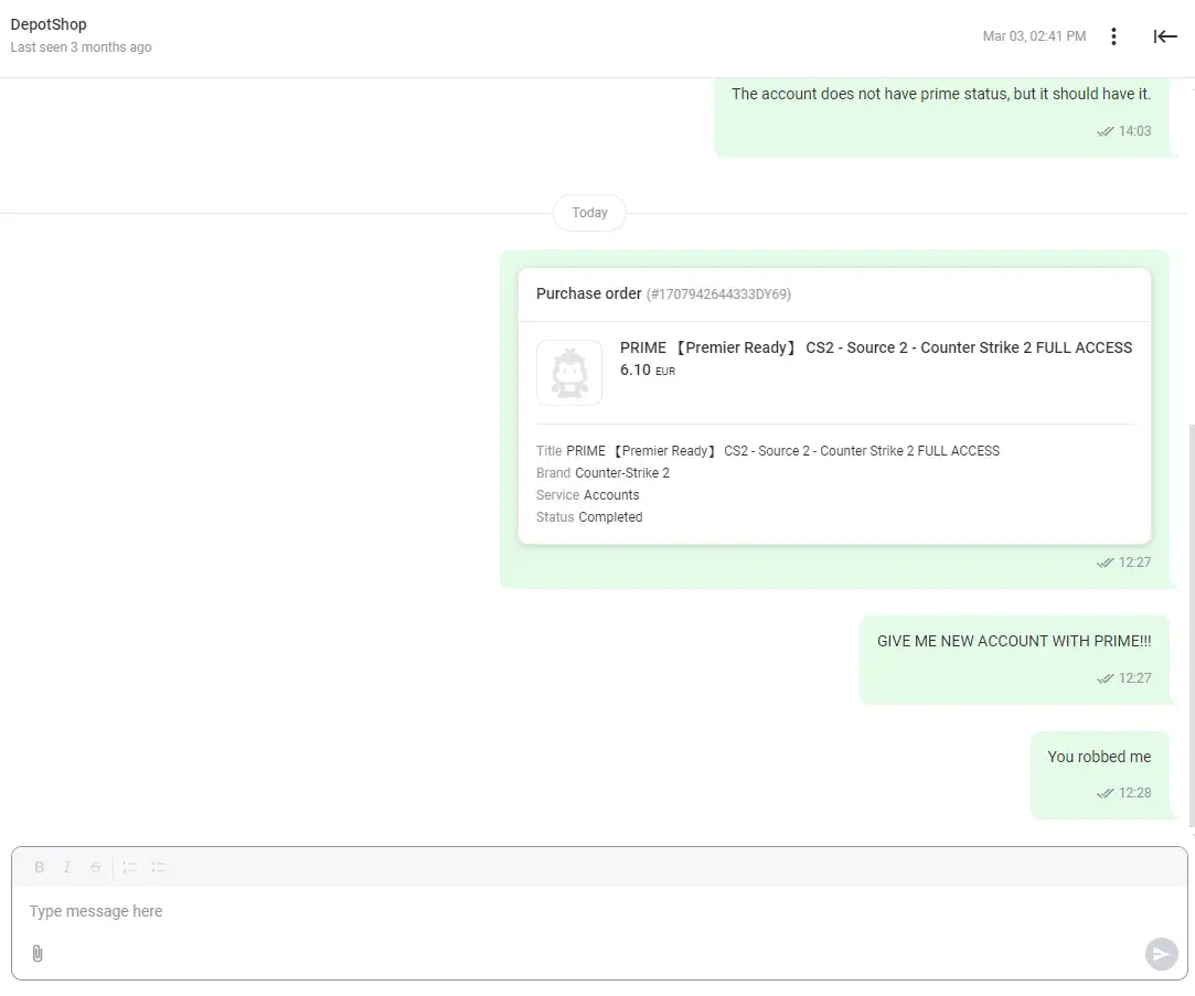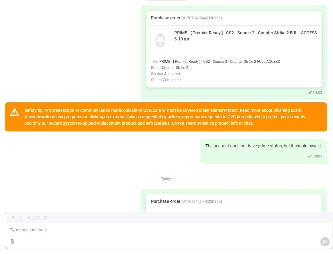 I bought an account for CS2, it was supposed to have prime status, but it didn't. I wrote to the seller in the chat, but I did not receive any response. I reported the case to support and each time I received the answer "The reported case has expired."