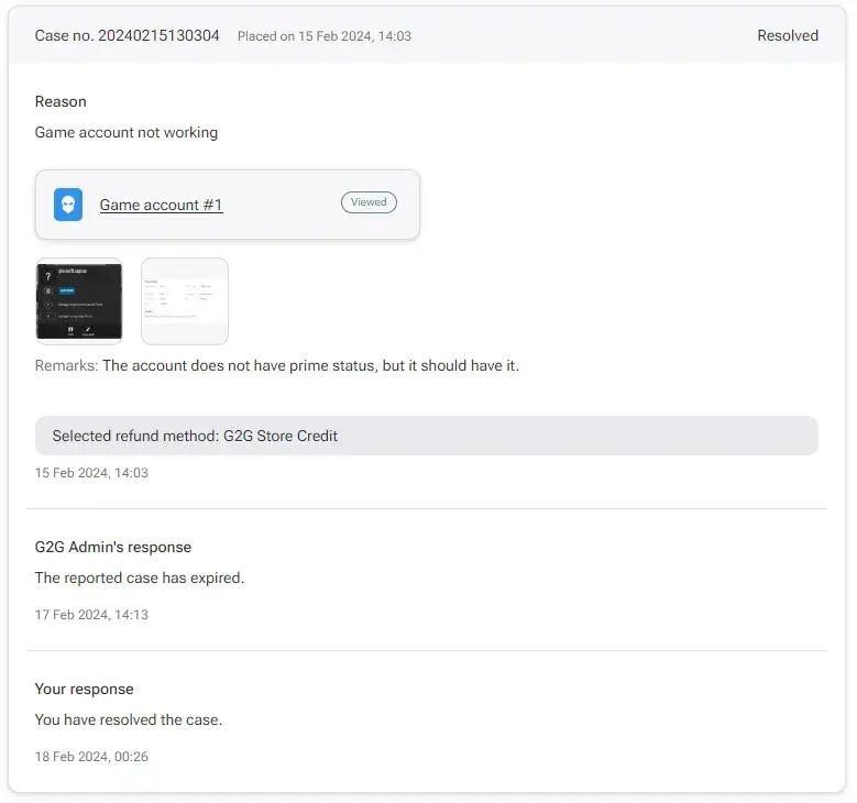 Now, I've bought from other websites before and I've had similar issues. But, I've never had to wait this long for a solution. In fact, I once got a result within 15 minutes! All I'm asking for is a store credit so I can get another account. It seems like a pretty simple solution to me, but G2G is taking way too long to get it done.