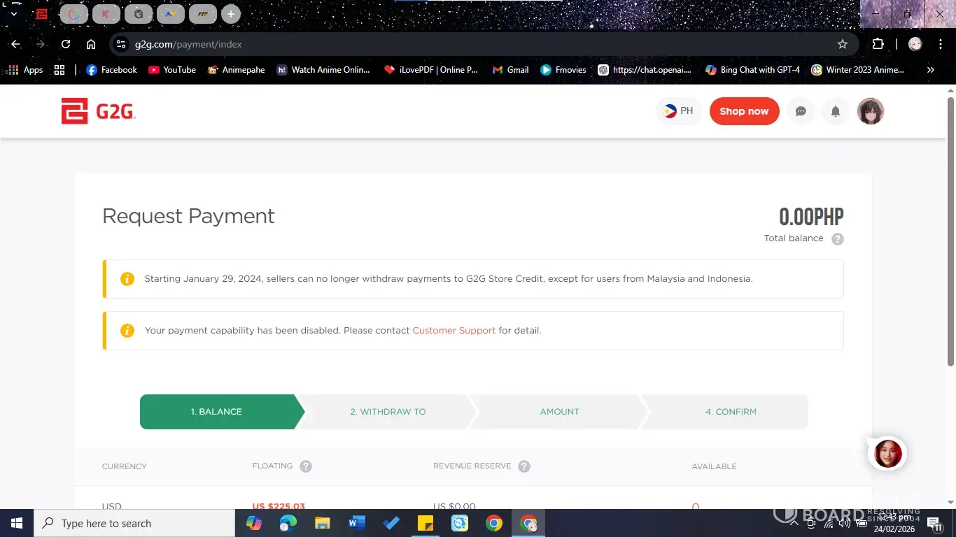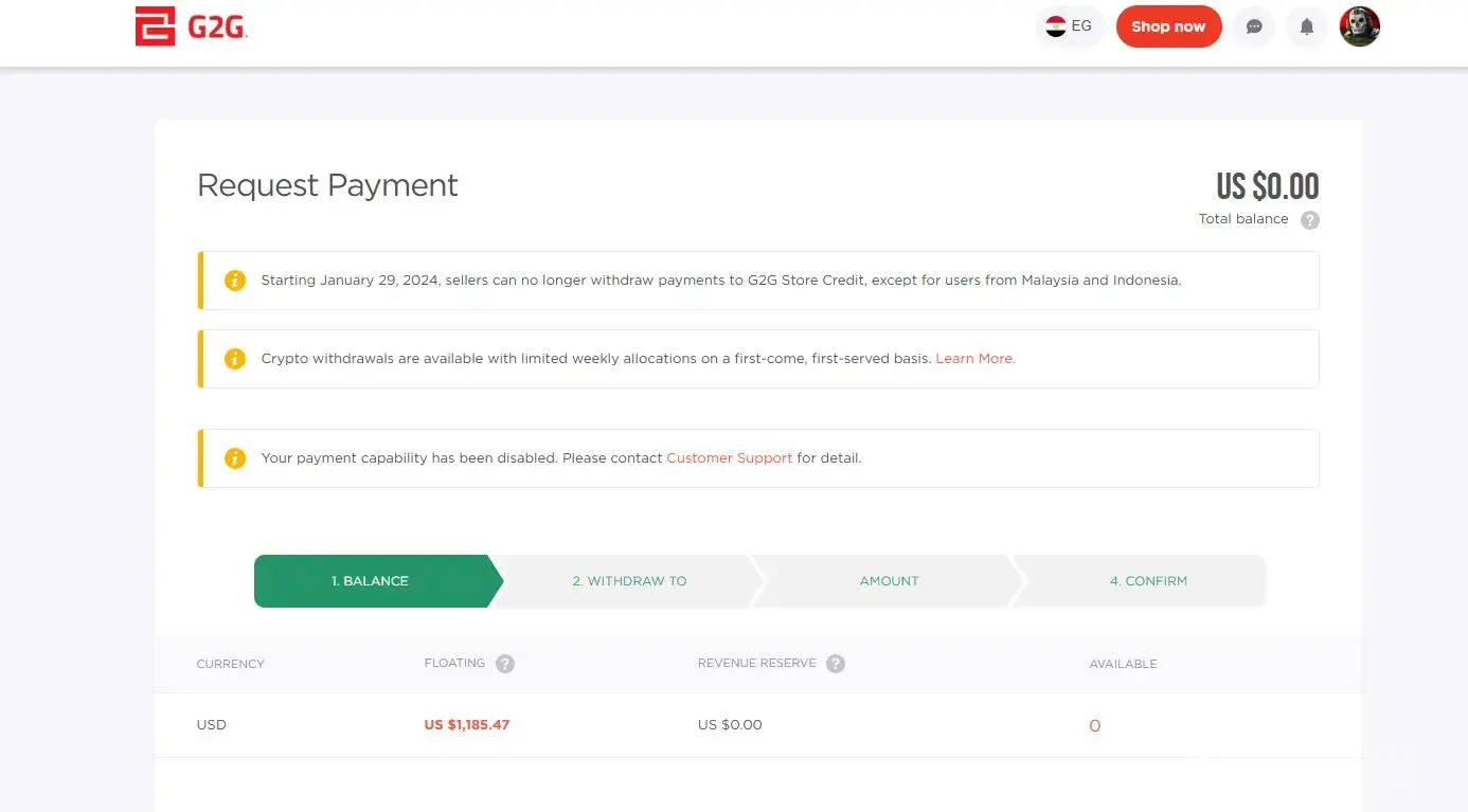 Today is 25 august 2024 I opened my g2g accoount and saw that the had does something which dosent make sense also the buyer has received the item no issue with buyer they disabled my payment capability, as your payment capability has been disabled. Please contact customer support for detail. By g2g on my payment page, this is very shame full when there i...