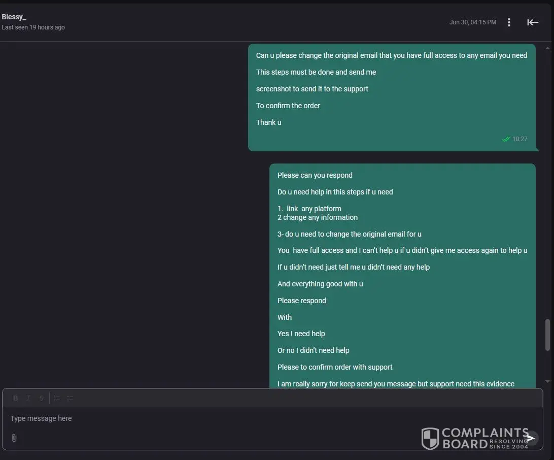 Firstly, in my order with ID [protected], the seller delivered an unsecured account that I am unable to change any details for, including the email ID or add 2FA protection. I immediately raised a complaint with your support team to report this issue. However, to my dismay, the support team's response has been highly inadequate, repeatedly advising me to contact the seller directly. The problem is that the seller has been inactive in the chat for the past 6 days, making it impossible for me to get in touch with them. It's clear that the seller is not taking any responsibility for their actions, and I am left with an unusable account without any support from G2G.