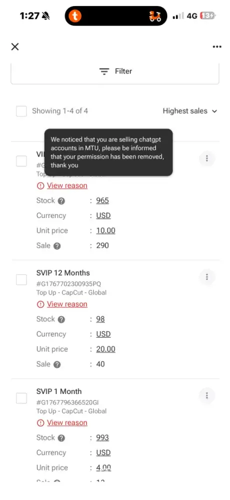 i got my selling permission stopped too! you already took my floating money for the blackmailer buyer and stopped my selling! please restore my selling permission at least!