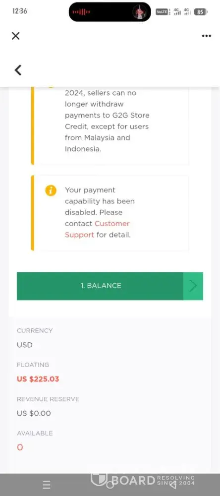 g2g disable user payment capability without any notice which means the user can no longer withdraw money for anything sold.